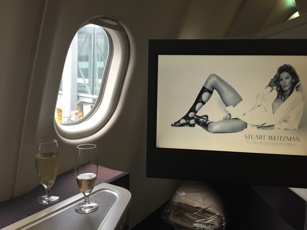 Back where I got off 4 hours ago, hello seat 15A. I got thanked for flying again with Cathay and then offered champagne. Well, of course. Before I was even half way through that another one arrived, curiously. I do believe they were trying to get me drunk. The entertainment system doesn’t work until you leave the gate, so the screen just shows a series of information screens and ads, one of which was so inappropriate for general viewing it was virtually soft porn.