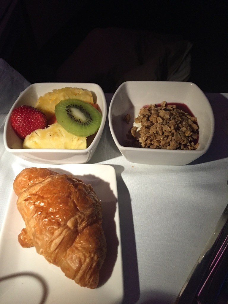 I wake up feeling fairly well rested, just as the breakfast service is starting. It’s about 0420 Sydney time. Breakfast is less sugary than on the previous plane and includes some half decent bacon but bland egg. The berry smoothies are delicious.