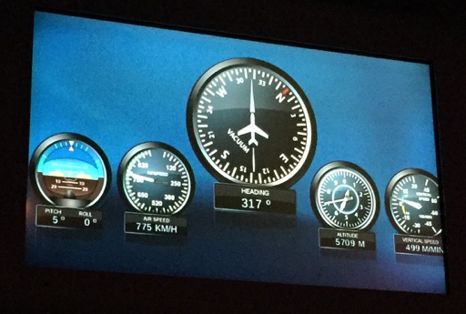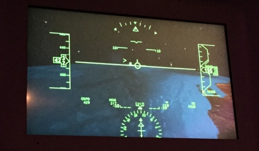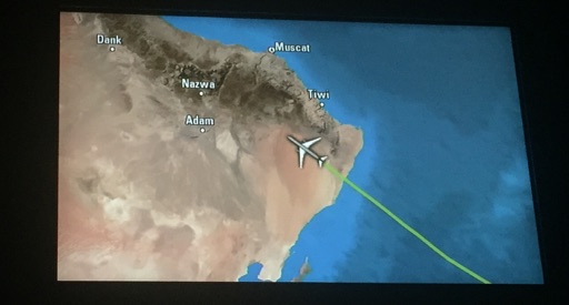 Also, there are pyjamas! These are rare - unique? - in business class. It’s a nice top and it comes in a fabric bag; I don’t bother donning the bottoms. The amenity kit is still the confusingly toothbrush-free one I got last week. There is a bottle of water hidden in the armrest as well as a USB plug. Also in front of me a wall-mounted screen showing an excellent moving map animation with some cool flight simulator style displays.