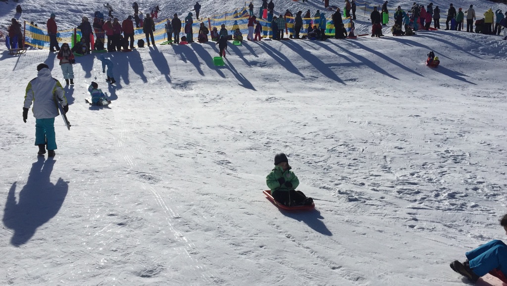 With some trepidation, Alex sits on her tray and grabs the steering rope and is set off down the smallest slope and WHEEEEEEEEE THIS IS AWESOME. Harry has more trepidation and on her run swipes straight into two careless lads, yet loves the experience even more, finishing with a monstrously cute dance and cries of AGAIN! AGAIN! AGAIN! This repeats for ages and does not get boring for any of us.