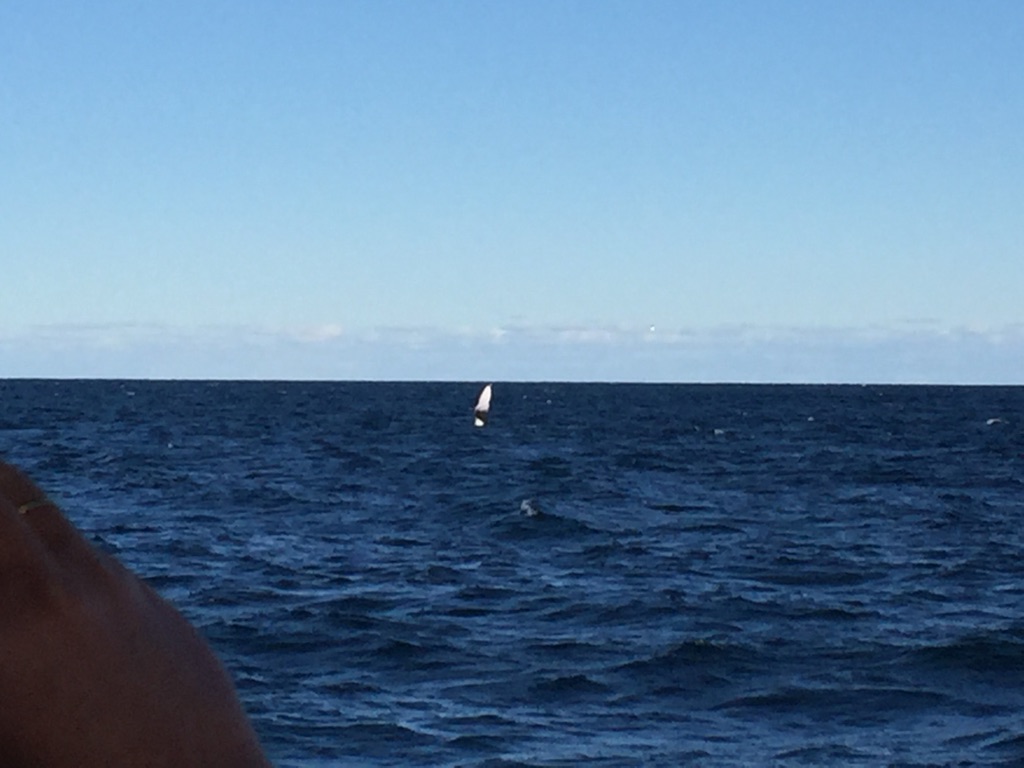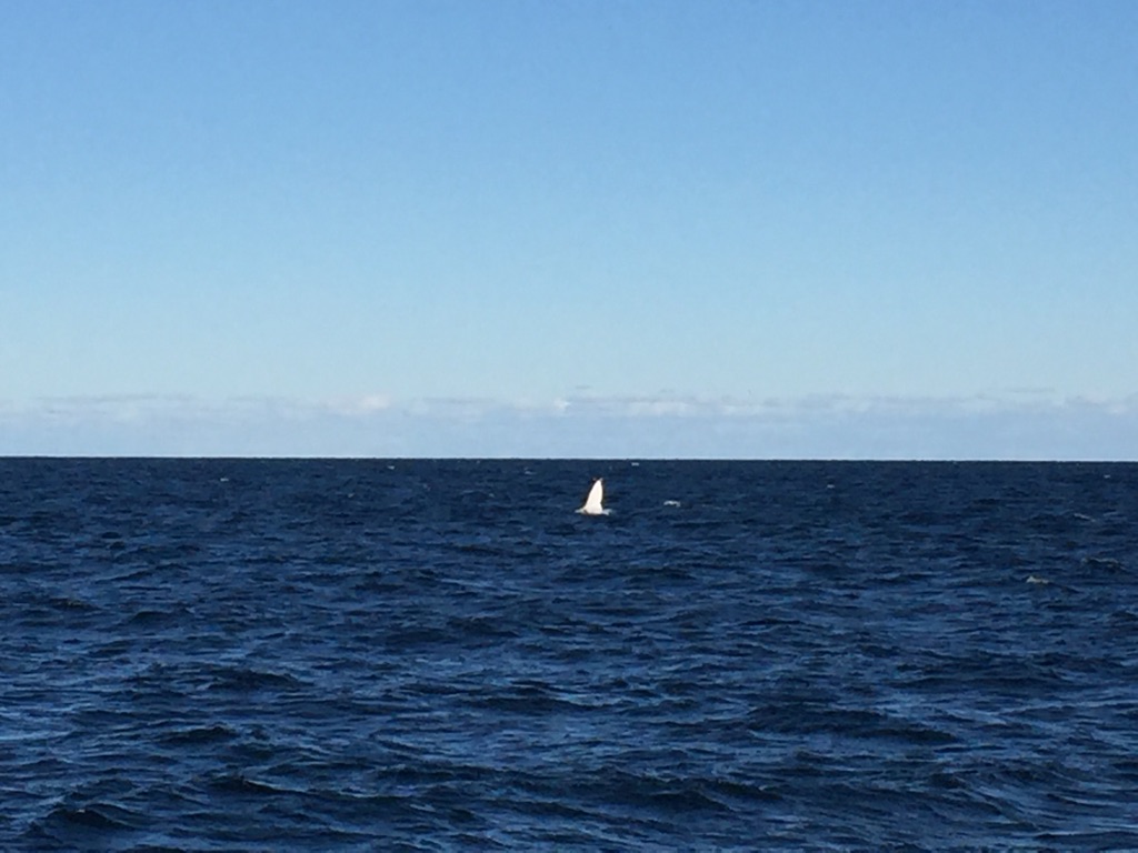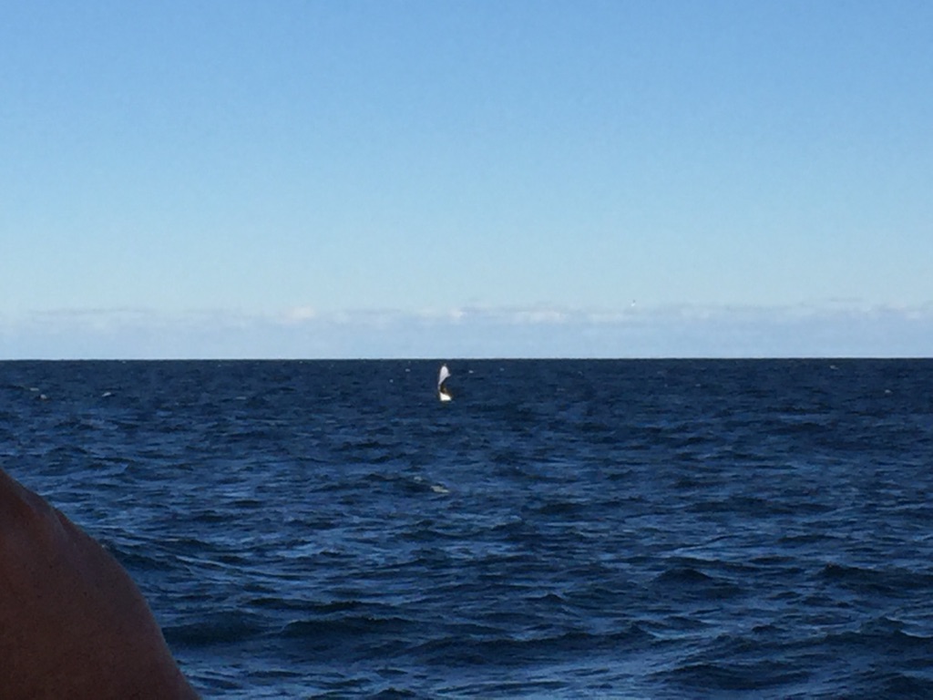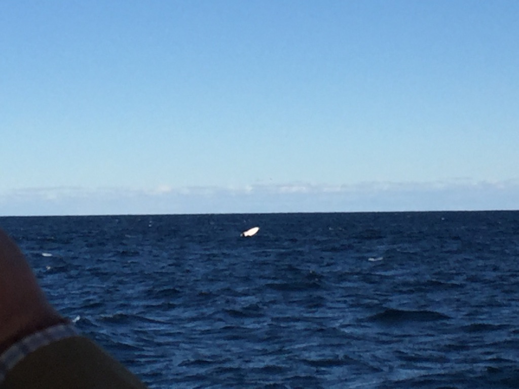 The next hour or more was spent watching whales. We saw their backs poking out of the water, a bunch of spouting, and a few decent shows of breaching and tail whipping.