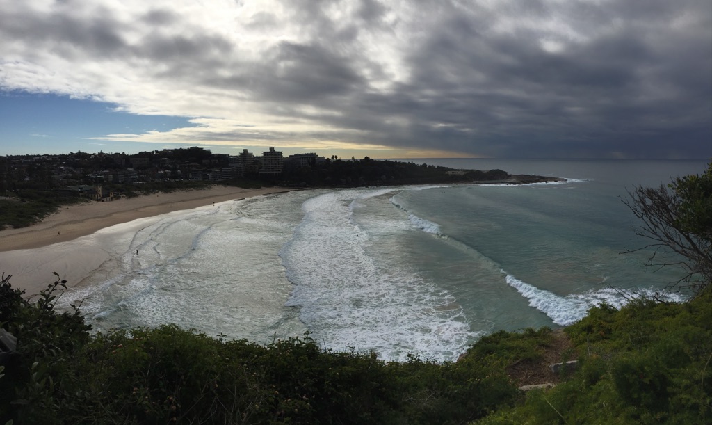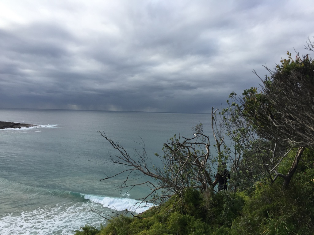 They have stuff on today - H is at day care, AJ at “football factory”. Sal is back to work. Kevin and I drop the girls off and then go for oeuvos rancheros breakfast which is great. We walk around a nearby viewpoint with signed dangerous edges and great views across a tricolour sky over a beach and bay. Surf is threatening.