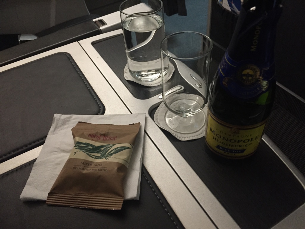 Oh! Here’s my champagne and nuts! Yay! Haven’t even been left to take the top off myself this time, and I got referred to as Mr Foreman. They really are pulling out the stops with only 1/5th of the cabin in use. Wonder if I can get them to make me a negroni?