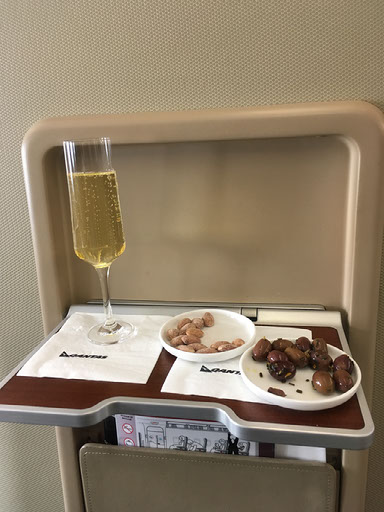 Airborne, some champagne arrives, of course. I’m pondering why I’m so addicted to the stuff, and I think there are two primary reasons: