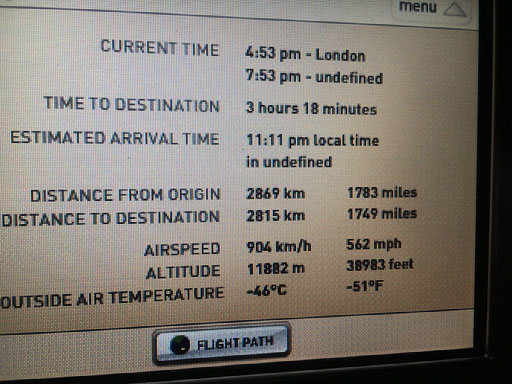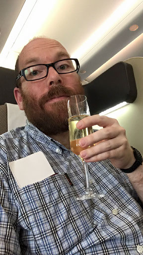 We’re on the ground for a fair while before setting off, so I’m online chatting merrily to Mark and Chris and looking things up on Google and whoa, this champagne is £100 a bottle! How many flutes in a bottle? Five? That means I’ve drunk £40 worth already because, a refill to go with my almonds and marinated olives? Why the fuck not.