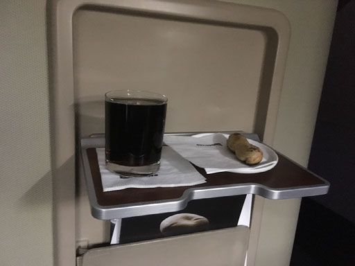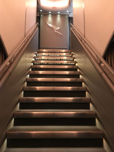 I need to make a better fist of staying awake, so I go to the loo - which has the best view in first class, since it has a window, and all the seats in the cabin are so far away from the side of the plane - and admire the stairs. Shall I go to the “lounge”? Nah, not yet.