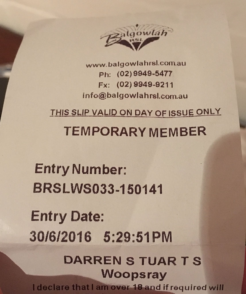 Dinner was at the local Leagues club, which is kinda like the British legion. I need my passport badly scanned to gain entrance. At 6pm I think there’s a power cut but no, everyone must stand, face west, and join in with a prayer for fallen comrades. Ok then.