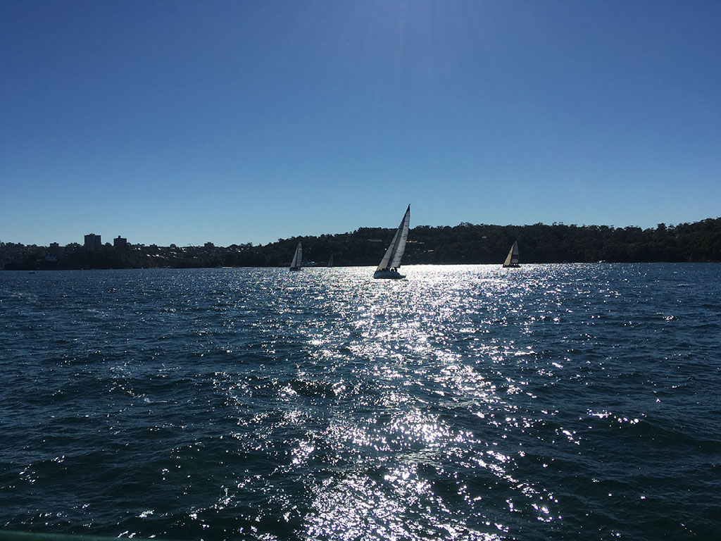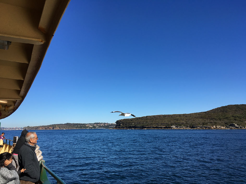 It’s the Manly ferry, staple ride of every visit to Sydney by every tourist and public transport for the locals. Half hour to the city centre next to the harbour bridge and opera house, on a gloriously sunny day. Sal is making her way over there by bus while we four sit on deck enjoying the view. Someone may or may not stick their tongue out when posing for photos.