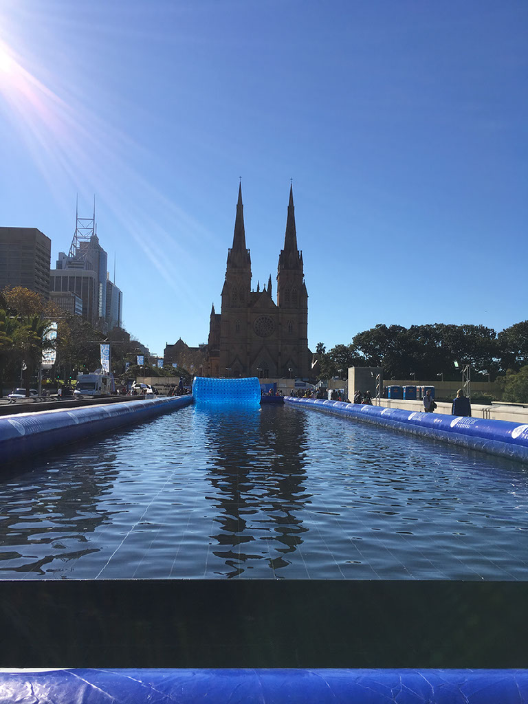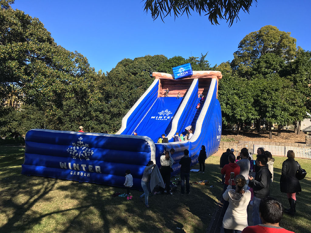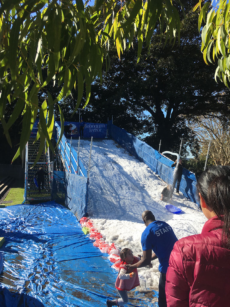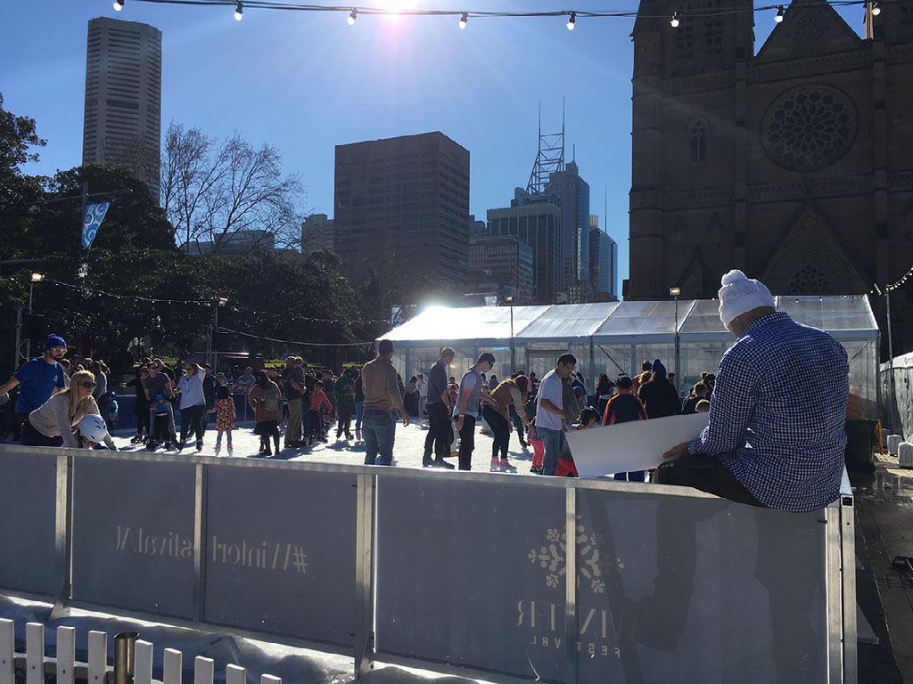 Our reason for heading into the city is to experience winter, Australia style. Regular readers of my blog may recall that the 2015 edition of my trip down under involved a proper 2 day excursion up country to where there’s real snow and everything. Well, this year we’ve headed to the Sydney Winter Festival, behind the cathedral and near the museum. It’s meant to be like Hyde Park’s Winter Wonderland, with a pop up Munich beer hall and ice skating and a toboggan run and other fun stuff.