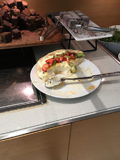 It’s bloody great. And empty. Not only-punter-here empty, but pretty damn close. I turn left, grab a seat in the genuinely empty section at the end, and go for a bit of an explore. There are long marble tables with places set for eating, a currently-closed self-service food area with a currently-open one at the other end, giant piles of cheese, decadent cakes, and disappointing goulash.