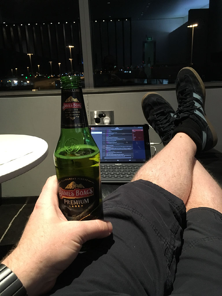 Back at my table I’m really bloody relaxed. It’s great. Nice background music, free sauce, wifi and power, a place to put my feet up, and a flight to look forward to. Fantastic.