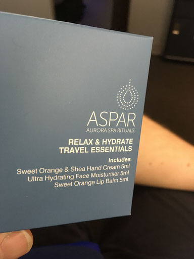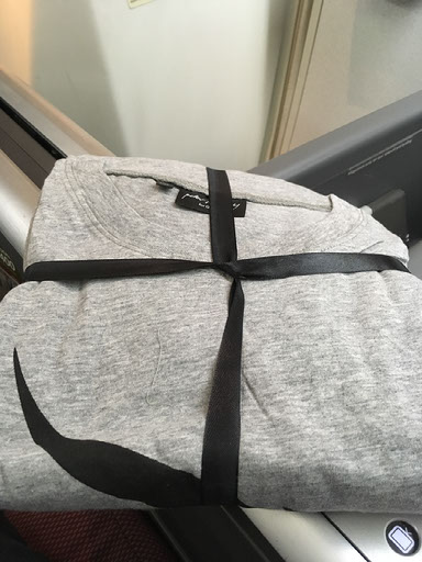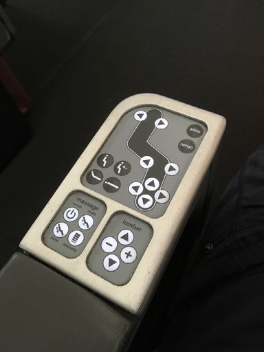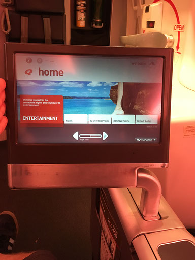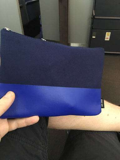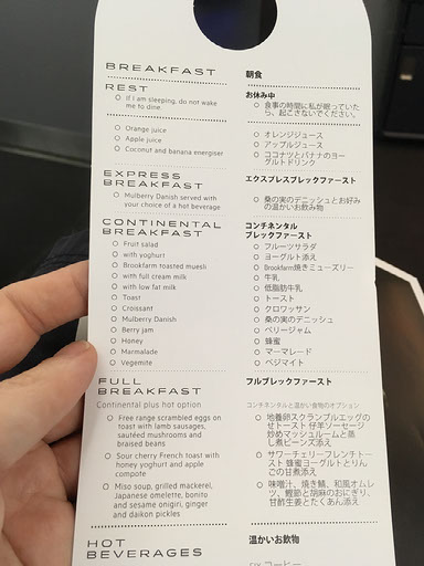 There’s a menu - though I’ve picked my food in advance - as well as a breakfast menu in the style of something you’d hang off a hotel room door to order breakfast room service. Some pyjamas arrive - pyjamas! In business! Is this only something airlines beginning with Q do or summat? Also an amenity kit, TV screen in the armrest, and seat controls which have a ‘save’ button. That’s new to me.