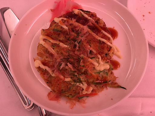 We take off, and service starts in a rush. This is an overnight flight to somewhere with a 1hr difference in timezone, so basically a genuine sleeper service with no jetlag. Before we even took off most people have changed into their PJs. I do so once in the air but before dinner, a meal lots of people forego because they just want to kip. I do too, but not before my okonomiyaki and cheese and Zoolander 2.