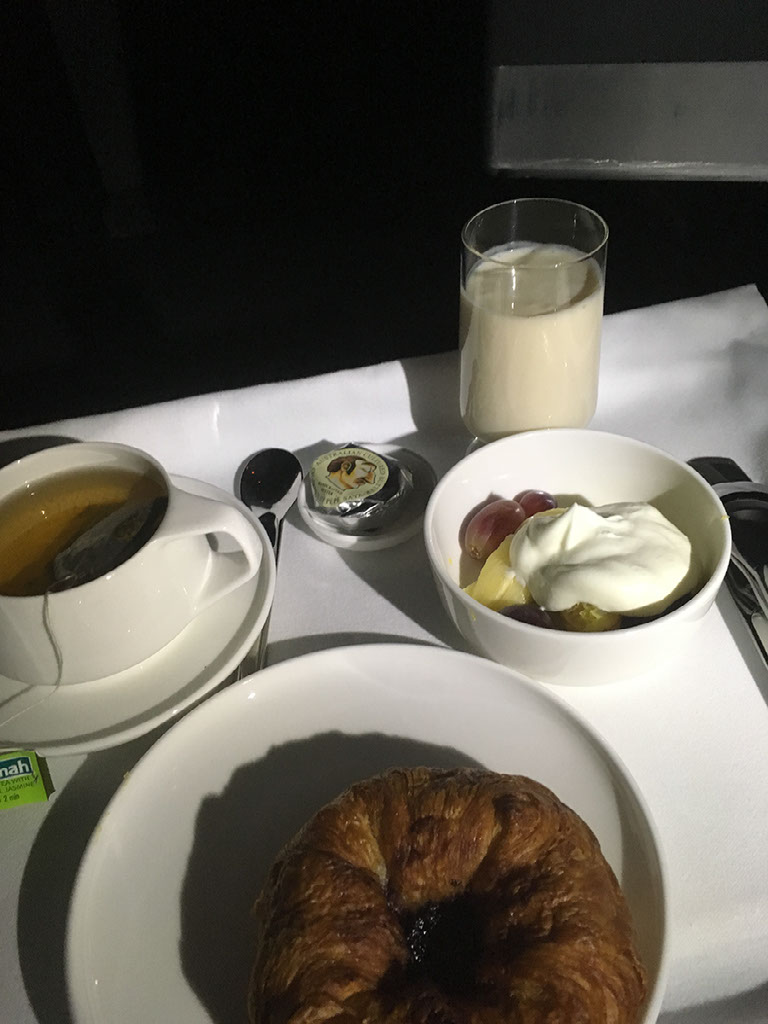 4-4.5hrs later I wake up. Tiny bit dehydrated, to be expected what with cabin pressure and that, but otherwise… I feel great. Like, properly great. The moisturiser from the amenity kit works wonders and I put the TV back on, to watch Sherpa, a documentary about Sherpas (duh) at Everest. It’s sad and frustrating but very very good.