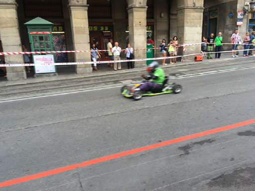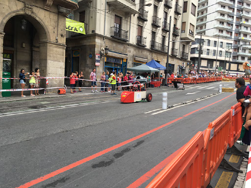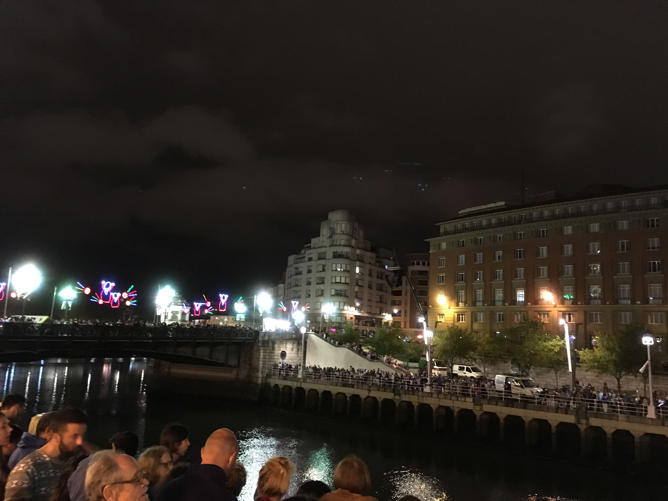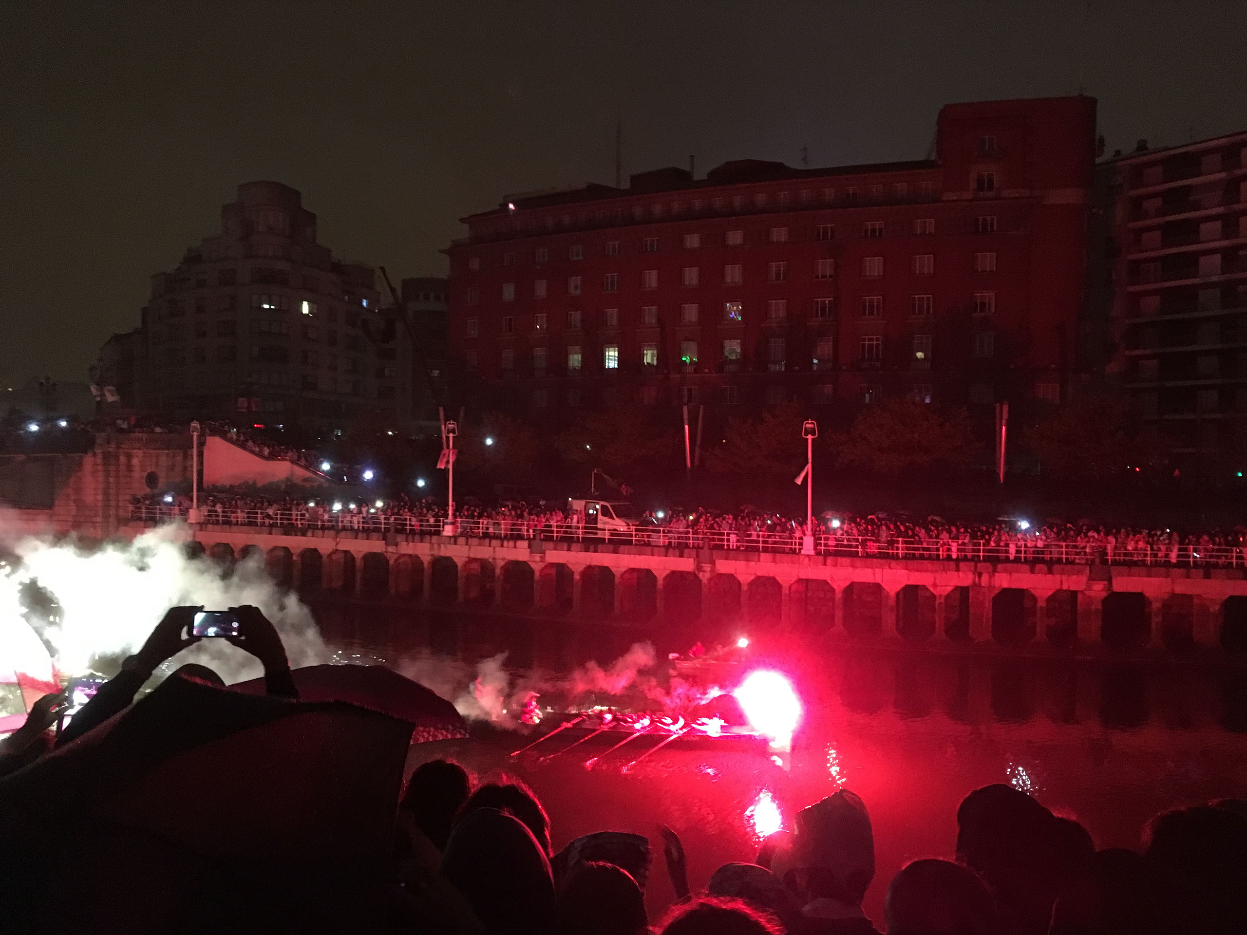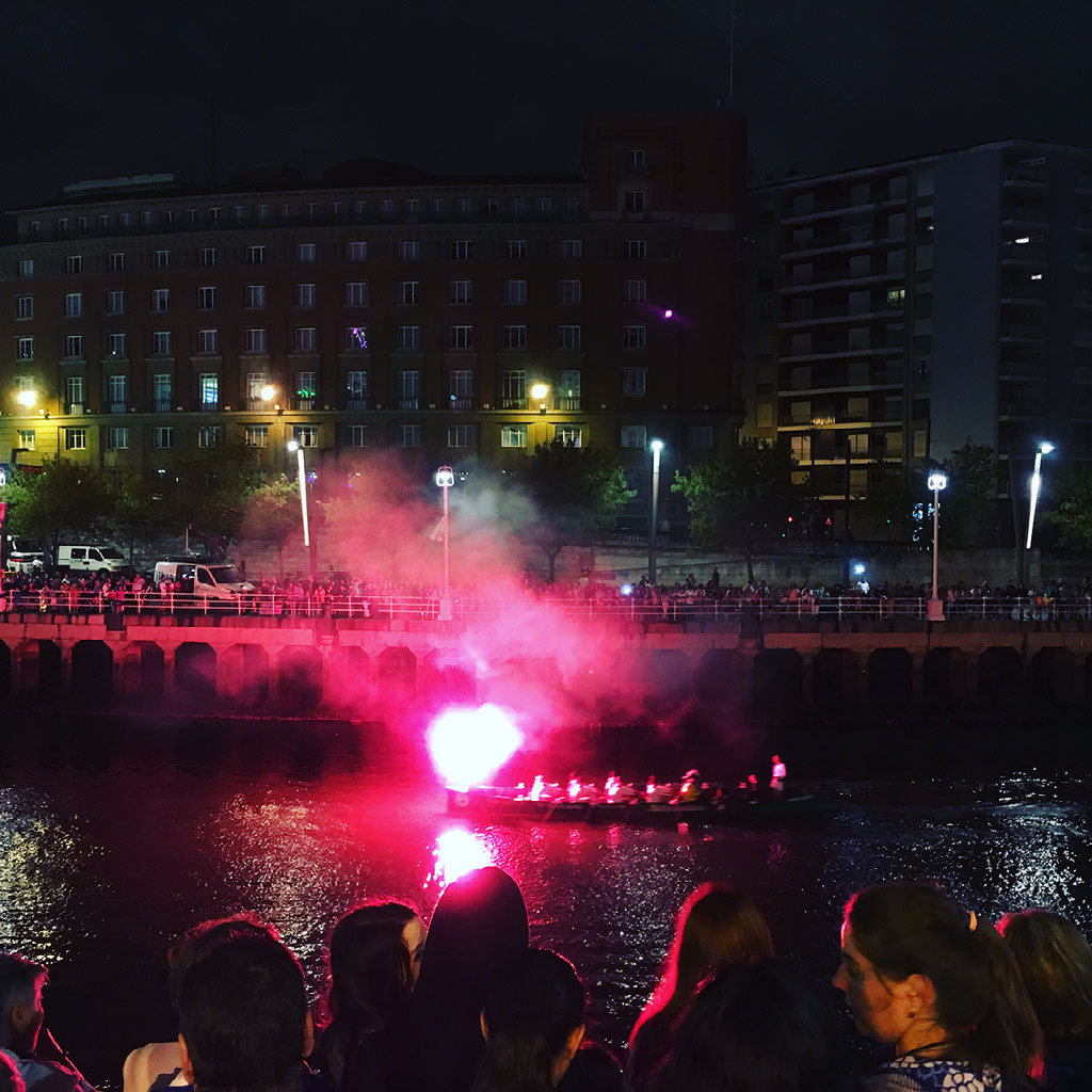 Barcelona are winning 1-0 when Helen wakes up, and the commentary says it has been raining. Sure enough, outside there’s very very mild drizzle. Totally groundhogging things, we head back to the left wing booze vendors to see what the last night of Aste Nagusia has in stall. Before we even reach them, however, we notice some shenanigans taking place on the river and a lot of people lining the frontage. Hmm?