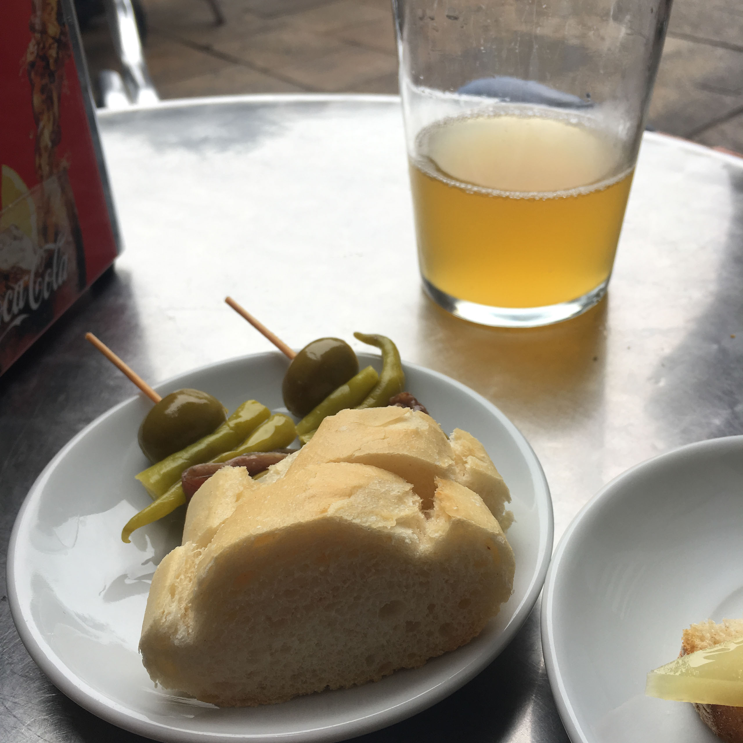 Topped up with some gilda pintxos: olives and peppers. Plus some “natural cider”, which was apparently nice. The smell made me want to throw up.