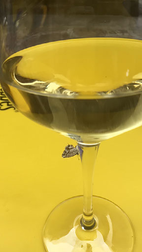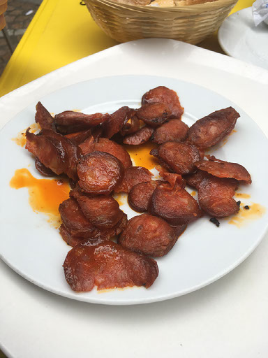 A few streets later, we find some open tables outside Cafe Lago and grab one with a menu. There’s a waiter serving people while he smokes, but he doesn’t come up our end until literally the moment Helen suggests we give up and go elsewhere. I’m proper grumpy now, but the beer we order comes quickly. We also ordered chips, and more chorizo. A moth comes to examine Helen’s wine.