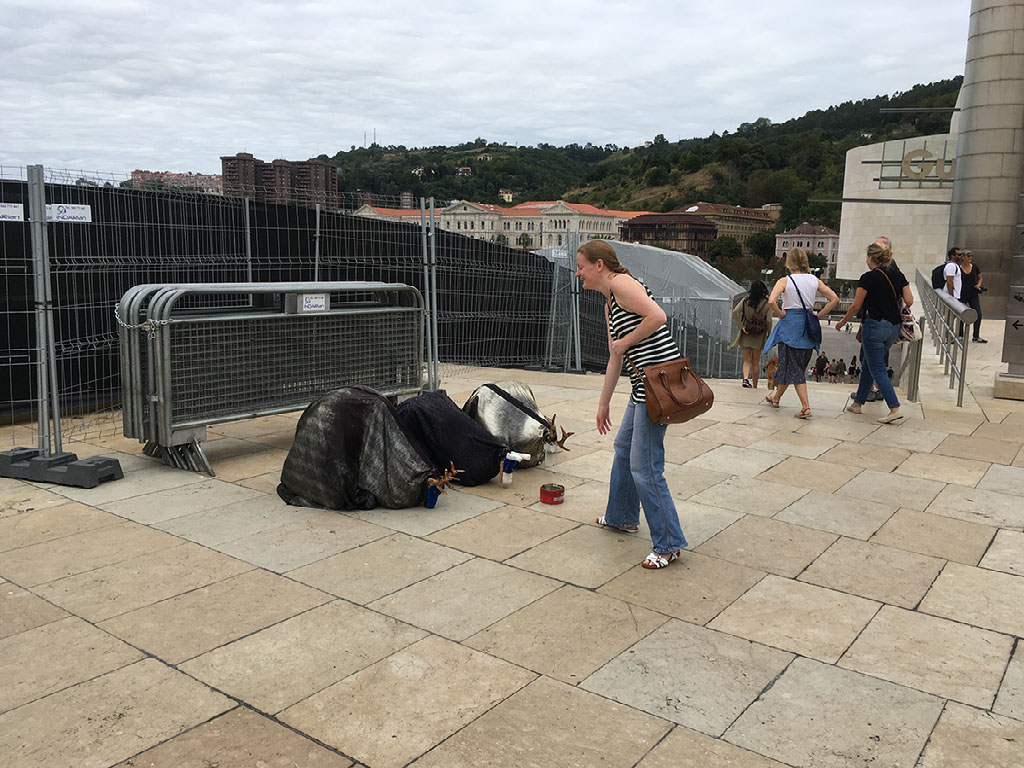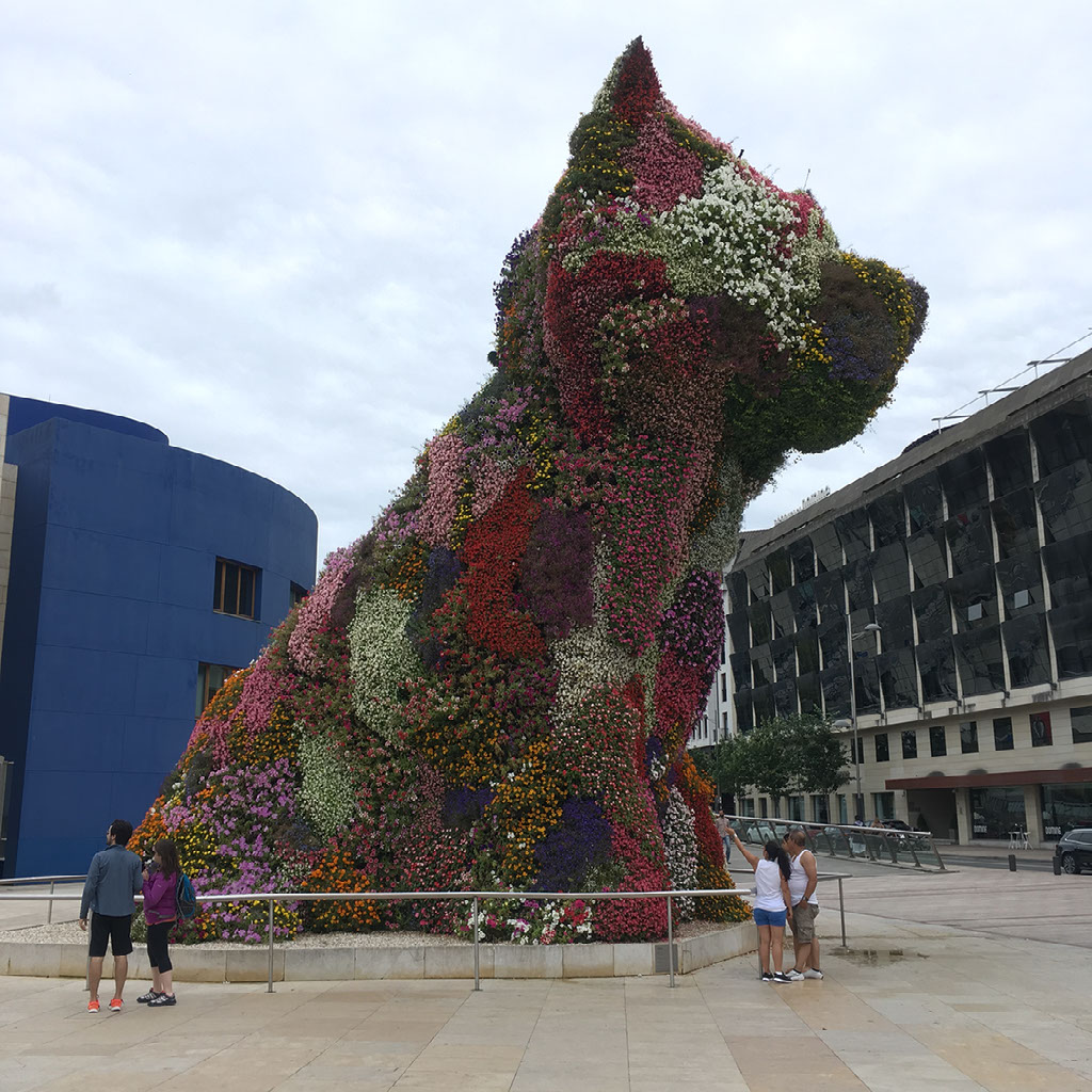 Considering the Guggenheim is visible from roughly 20 feet away from our hotel’s front door, it’s a curiously awkward place to reach. We have to walk away from it first, over a bridge, up some steps, up a lift, up a hill, along a deserted main road, and then, aha, here we are. A dog made of flowers.