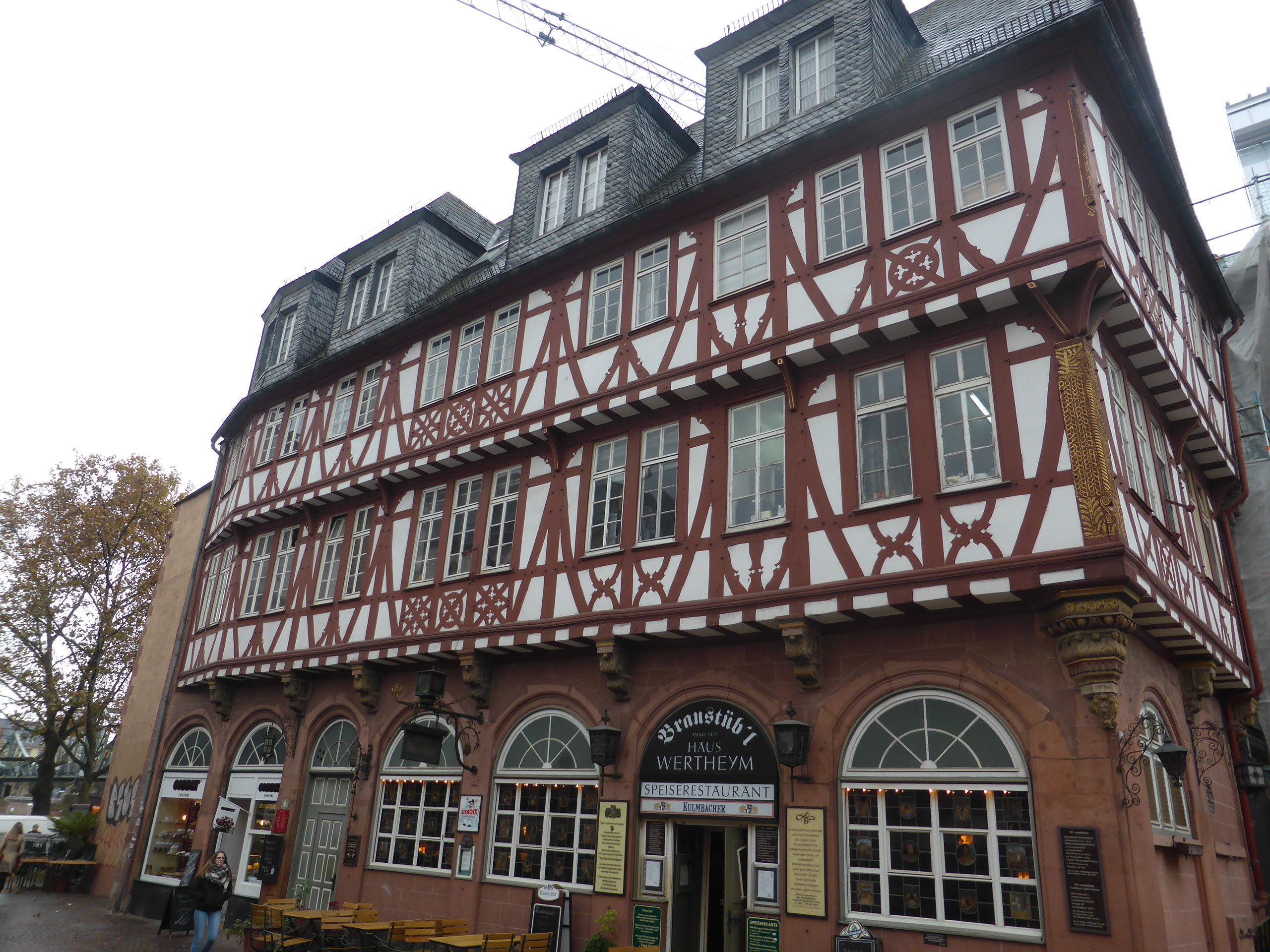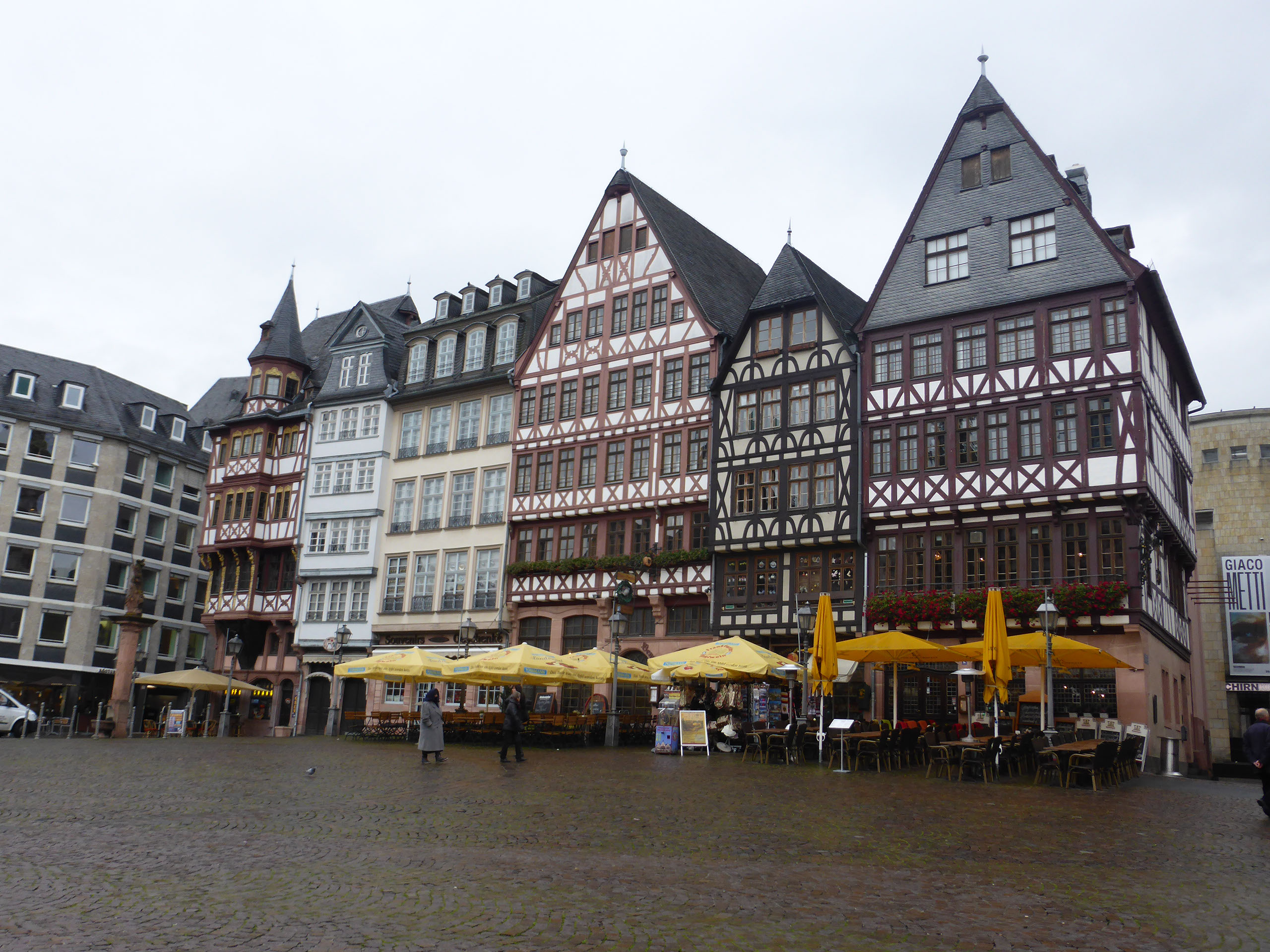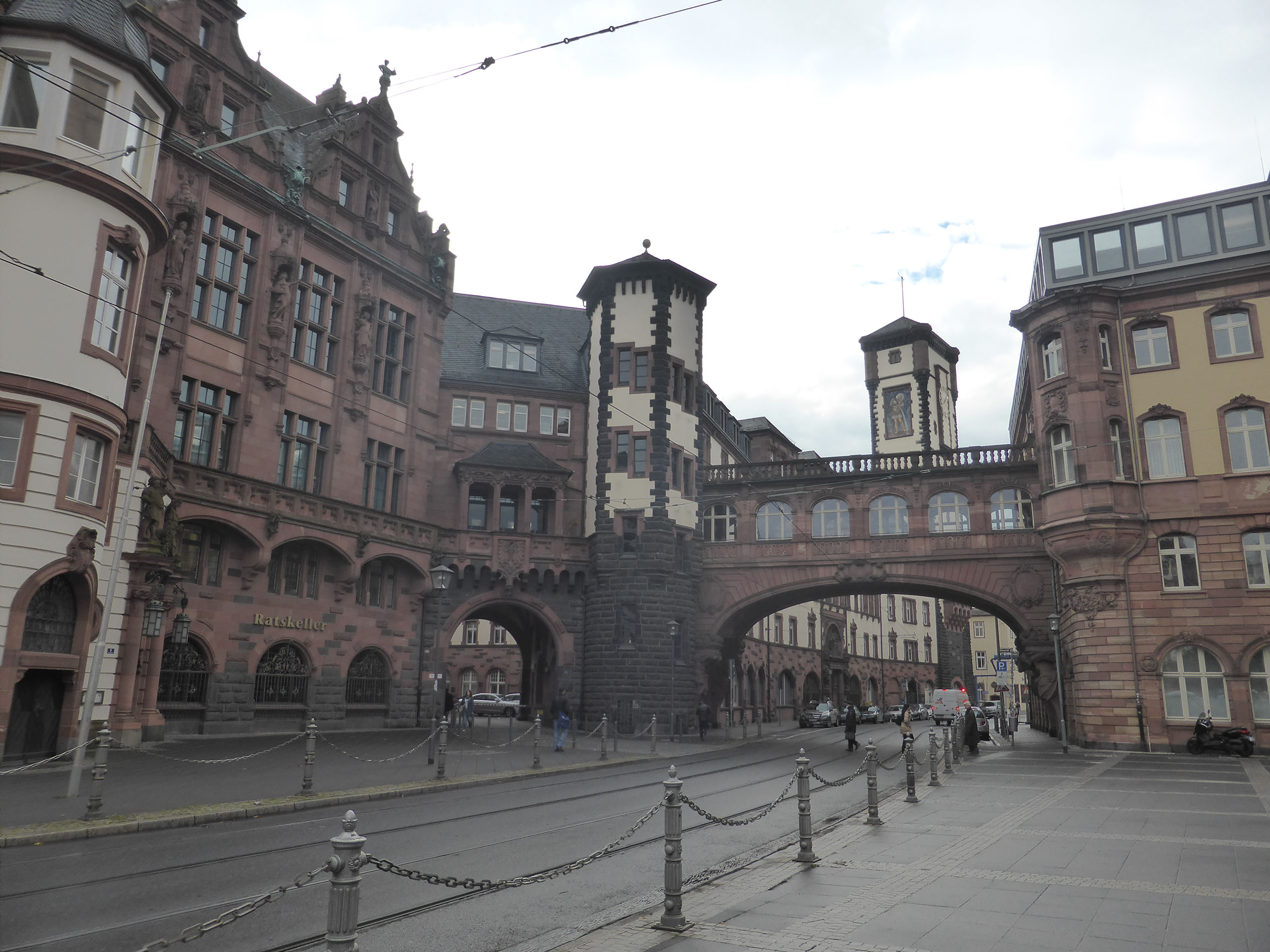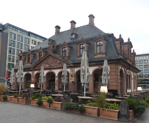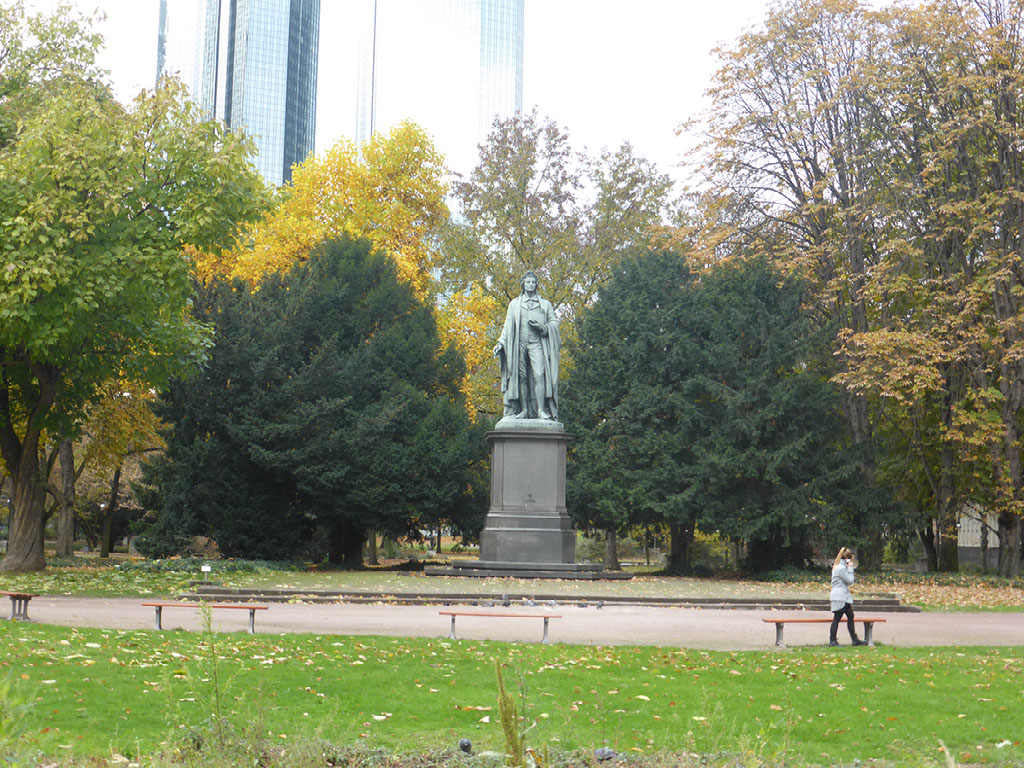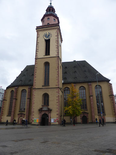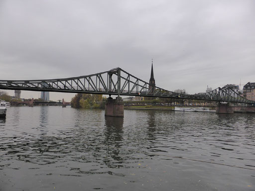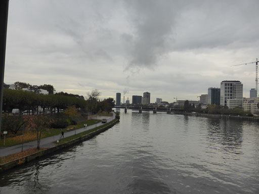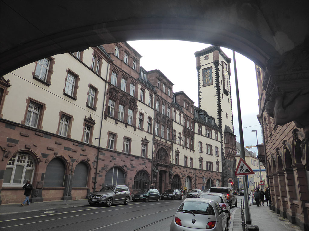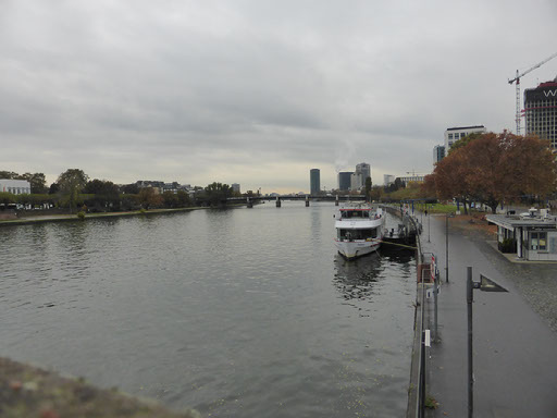 The woman at reception was very very friendly and told me exactly how to walk to the alt-stadt: out, right, left, halfway across the bridge, down the stairs, right. I was indeed just one block from the river Main. It’s a grim, bleak, grey, cold day, not quite raining but threatening to do so. The first things which catch my eyes are a large chimney belching fumes and a regular stream of aircraft landing at the airport (it is, after all, only 4 stops away on the tube) plus helicopters. No-one would really say it looks pretty, even me, but I am very happy with everything.