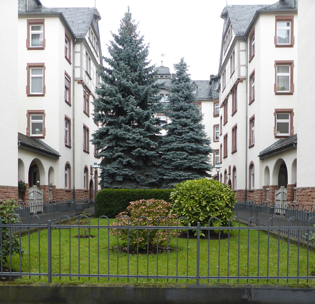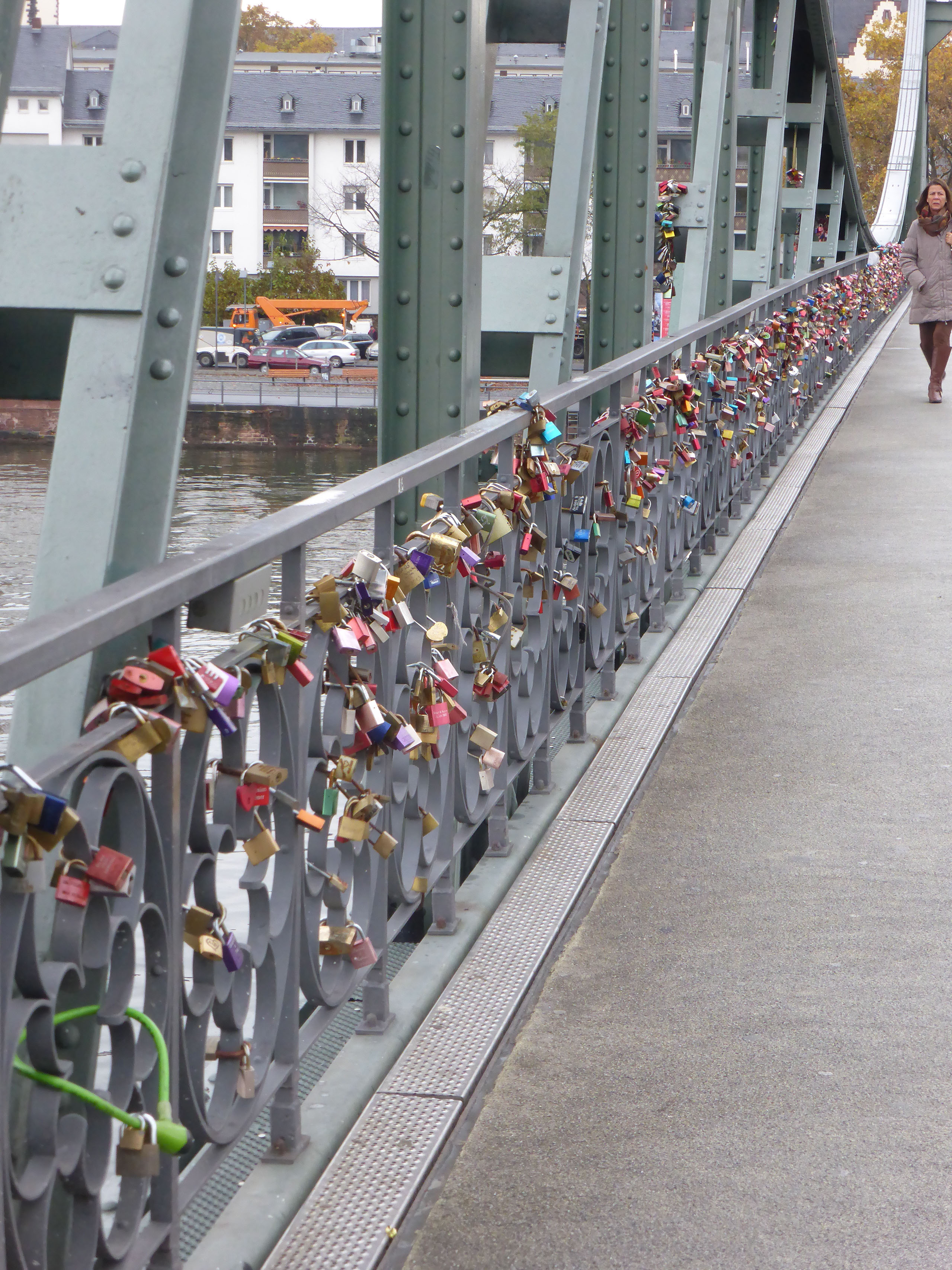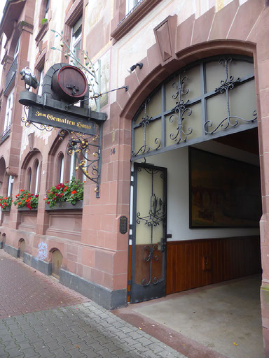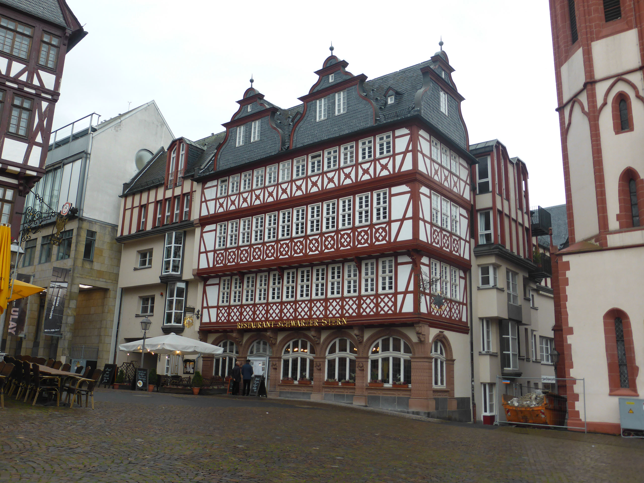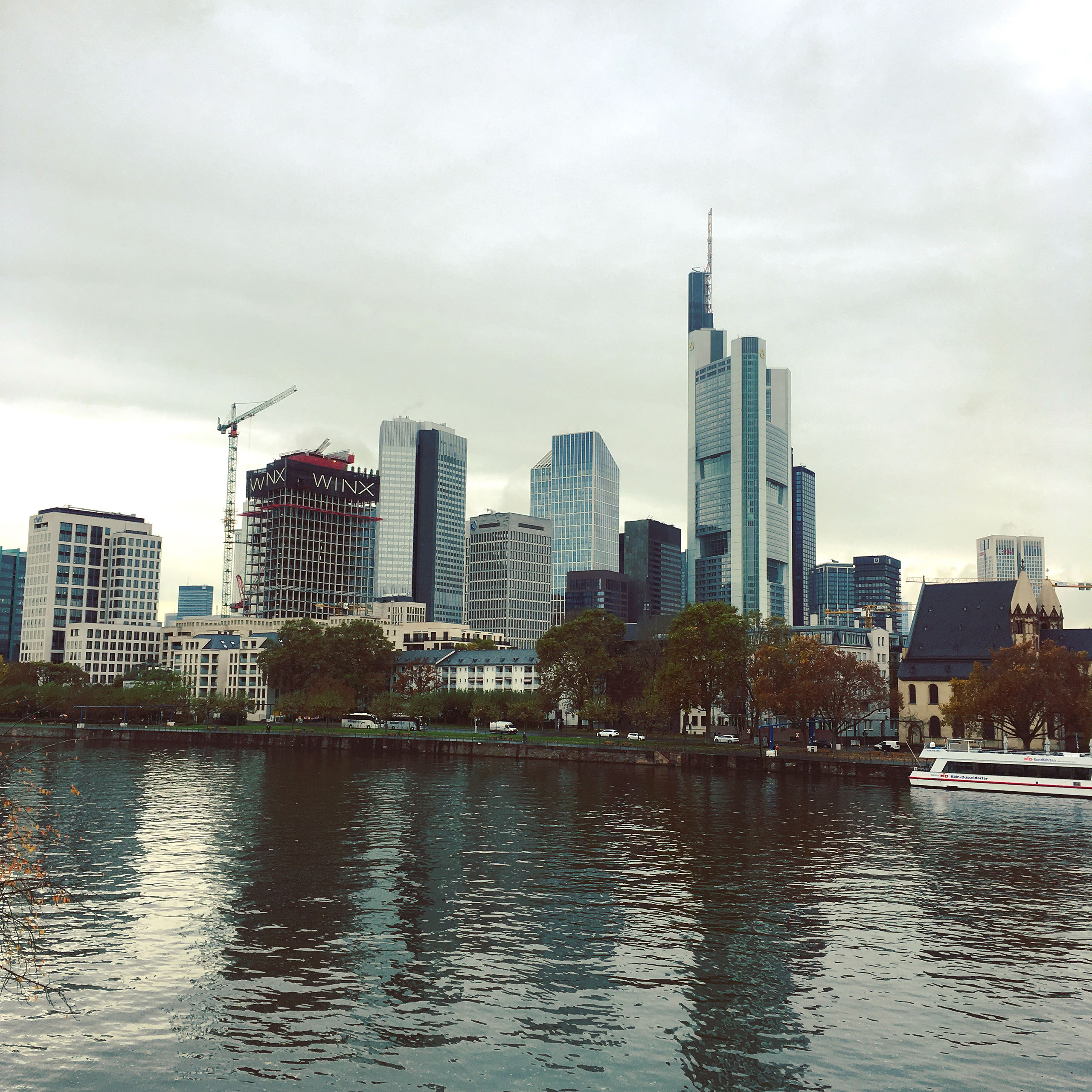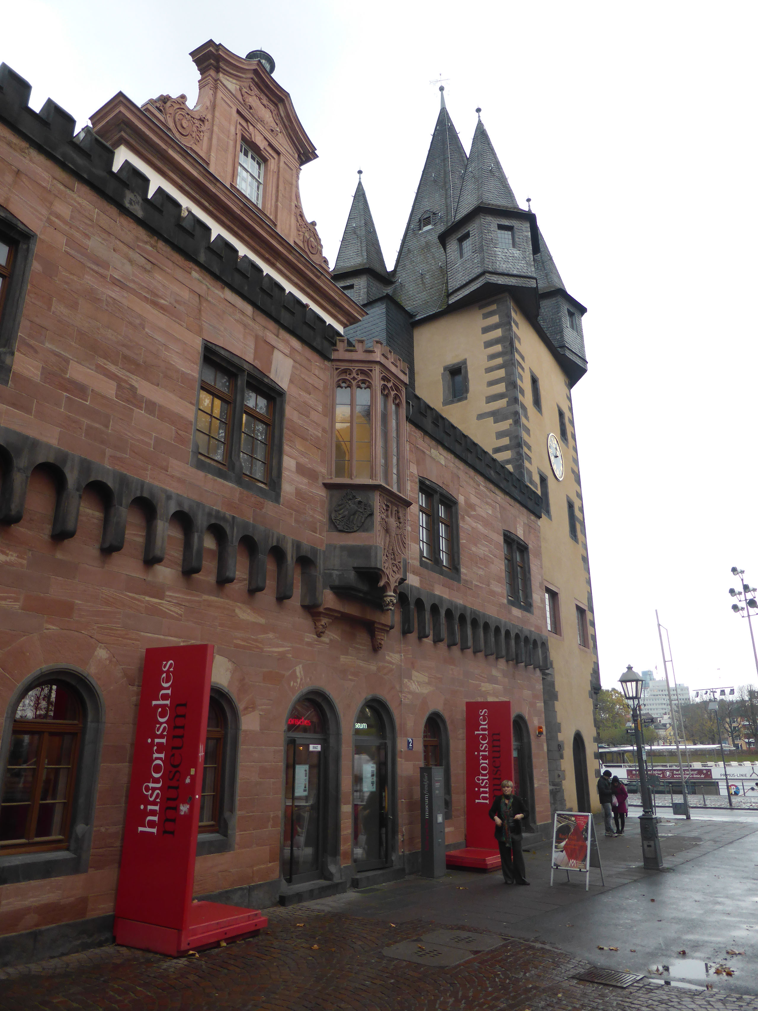 The woman at reception was very very friendly and told me exactly how to walk to the alt-stadt: out, right, left, halfway across the bridge, down the stairs, right. I was indeed just one block from the river Main. It’s a grim, bleak, grey, cold day, not quite raining but threatening to do so. The first things which catch my eyes are a large chimney belching fumes and a regular stream of aircraft landing at the airport (it is, after all, only 4 stops away on the tube) plus helicopters. No-one would really say it looks pretty, even me, but I am very happy with everything.