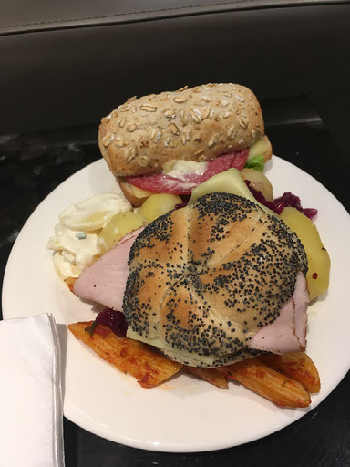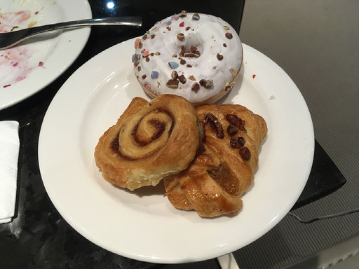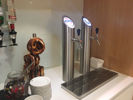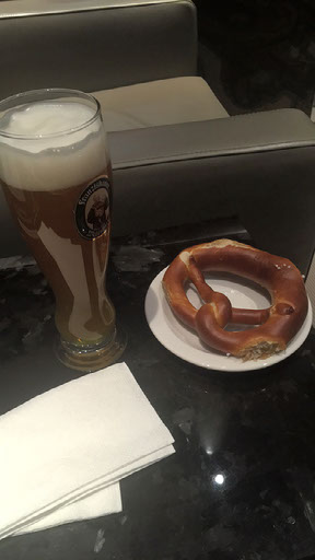 I totally fill my boots in this place. A glass of fizzy wine. A seat in the quiet area near the private booths with personal TVs. A plate full of pasta and cabbage and sandwiches and potatoes. Another plate full of sugary pastries and doughnuts. Another glass of fizzy wine - it’s really nice - just as a new bottle arrives in the bucket. A huge pretzel and self-poured glass of Franziskaner. This is what it’s all about.