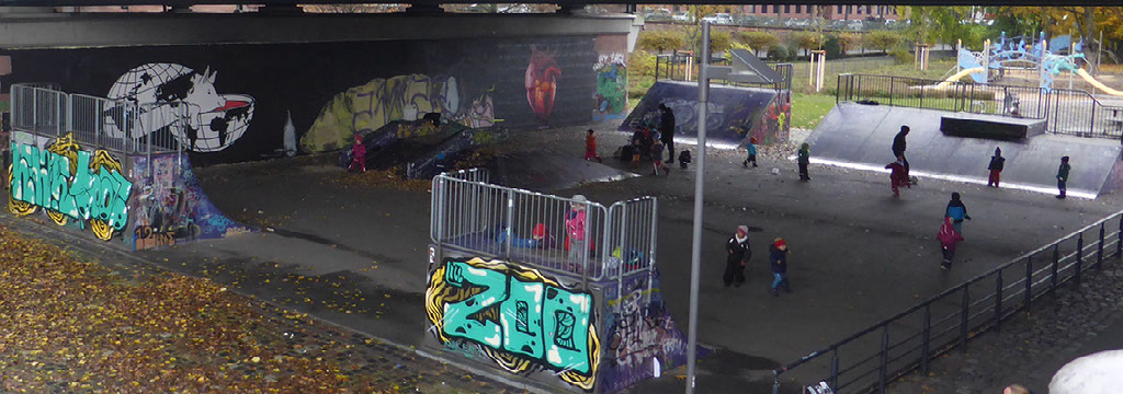 Underneath the bridge is a skate park, entirely occupied by small kids and their parents using it as a covered playground in preference to the actual playground next door. Mostly that means 4 year olds rolling down quarter pipes. Along the riverside park paths there are runners, few other people, and a slow police van. As I get closer to the good stuff my tinnitus goes absolutely crazy until I realise there’s someone with an angle grinder carving metal and everyone else can hear it too.