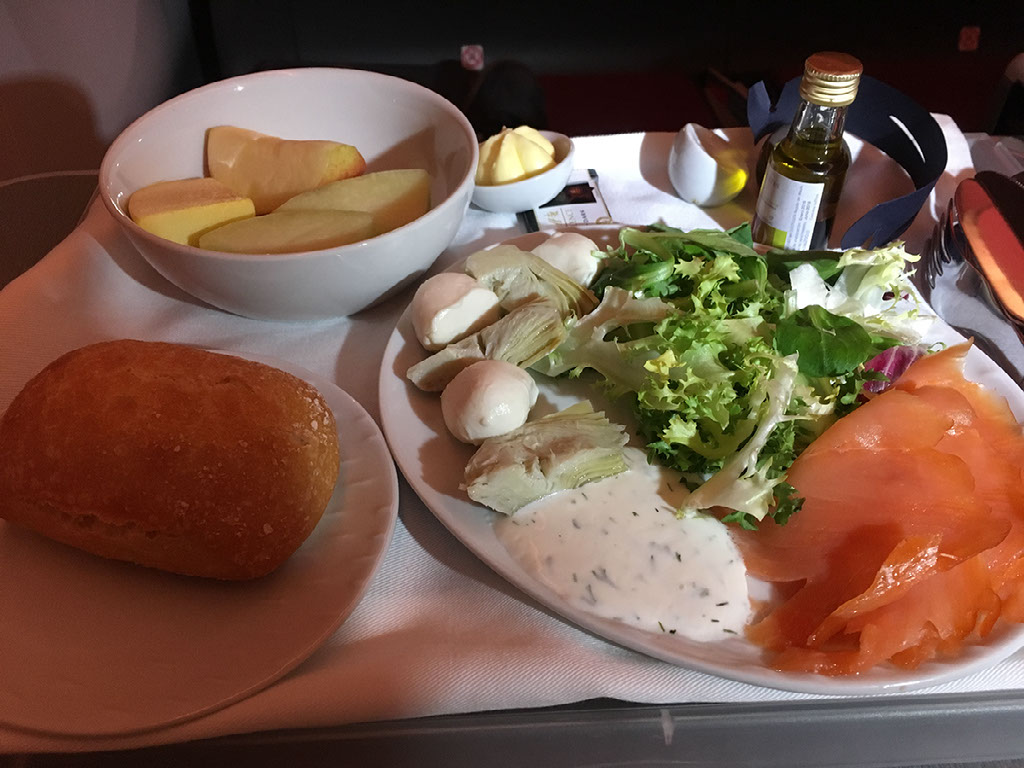 Food arrives. It’s a plate of salmon and mozzarella salad (with a LOT of salad), plus some boring fruit as dessert. The salad is really nice, and the guy offers to recommend wines but I just want the fizzy stuff. It’s not a problem, and a glass arrives, with another following once he comes to clear up the plate.