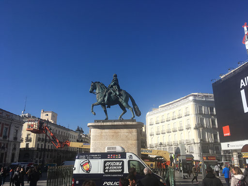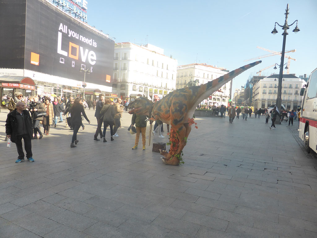 Turns out Sol is only about 5 minutes up here. It’s still swarming with people, if anything it’s worse now at around midday than it was earlier. I walk a couple of circuits as well as some zig zagging - I really want to find the zero point - and then have a lightbulb moment. If this is the place which defines “Madrid”, where all distances are measured from, then surely I can just ask Google Maps to show me where “Madrid” is? Sure enough, my phone says Madrid is about 30 yards away. I think perhaps there’s a dinosaur standing on it.