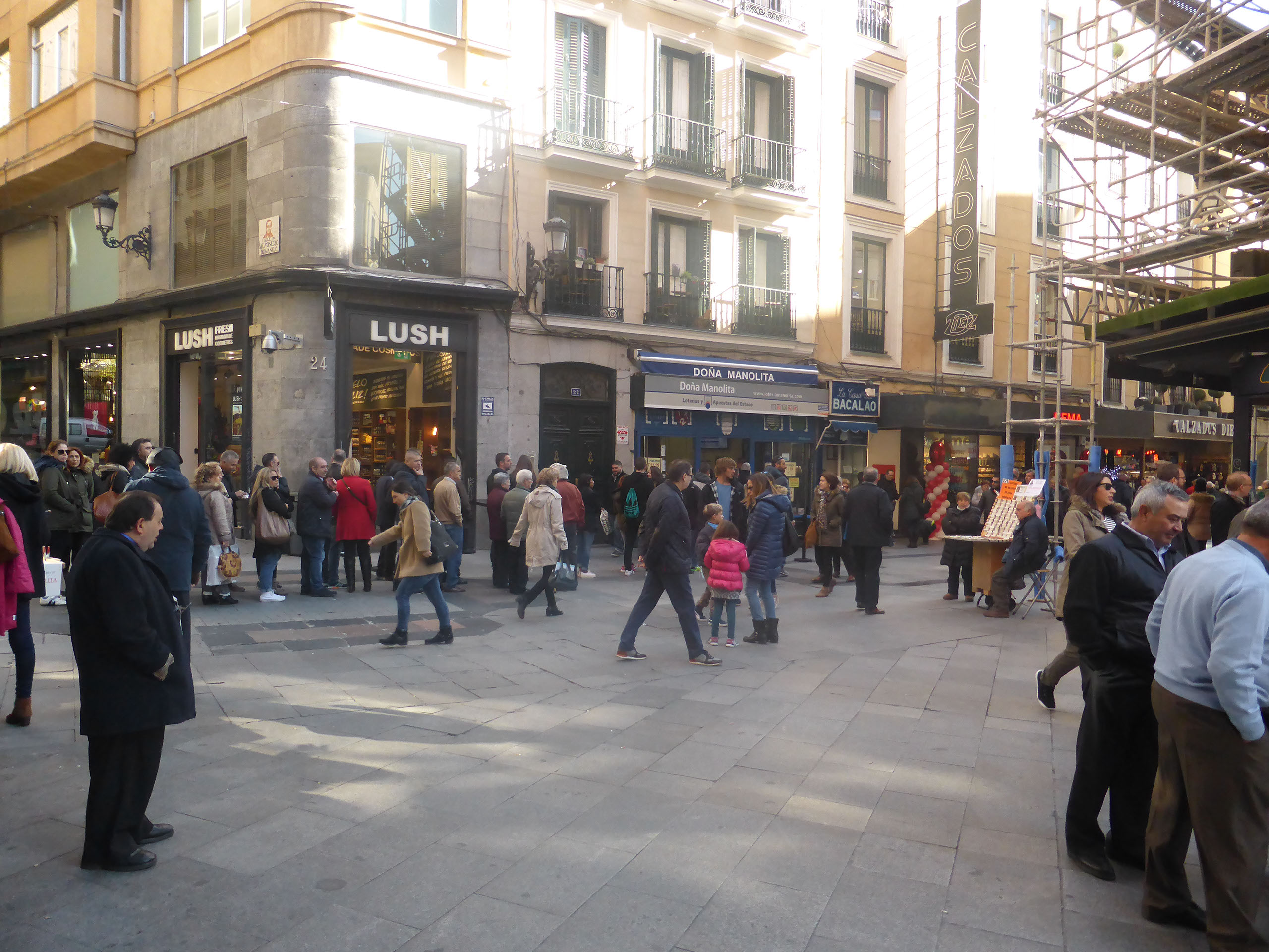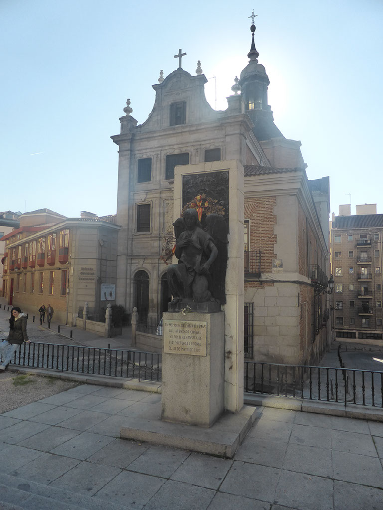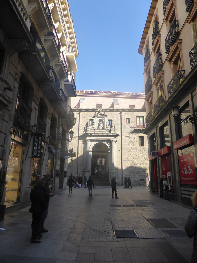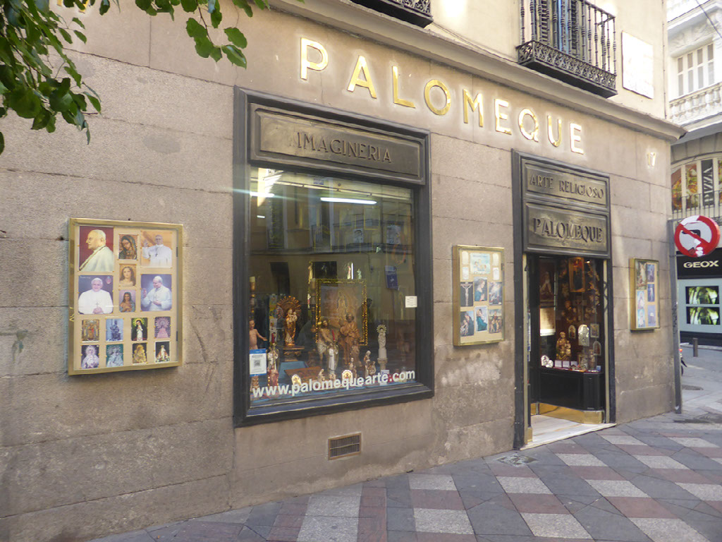 I want to go back to Sol and try again to find kilometre zero, and without using a map I just pick a direction which feels right - up a shopping street called Arenal, past some buskers playing Elvis and some more playing hold music. There’s some more excellent architecture, a church, and a fantastic religious iconography shop.