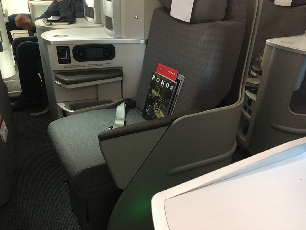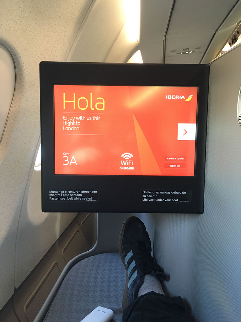 Anyway, soon enough we’re onboard. I’m in seat 3A for this Iberia operated flight from Madrid to London Heathrow. And this is the second centre piece of the trip, because forearmed with knowledge about flight schedules I have got myself booked on the one flight a day which Iberia use a long haul plane on. Just as with the flight yesterday, I’ve got me a fully flat bed and stuff for a 2hr flight. Huzzah! And it cost me £17.10 and a 12,750 Avios. I’m very pleased with myself, as always.