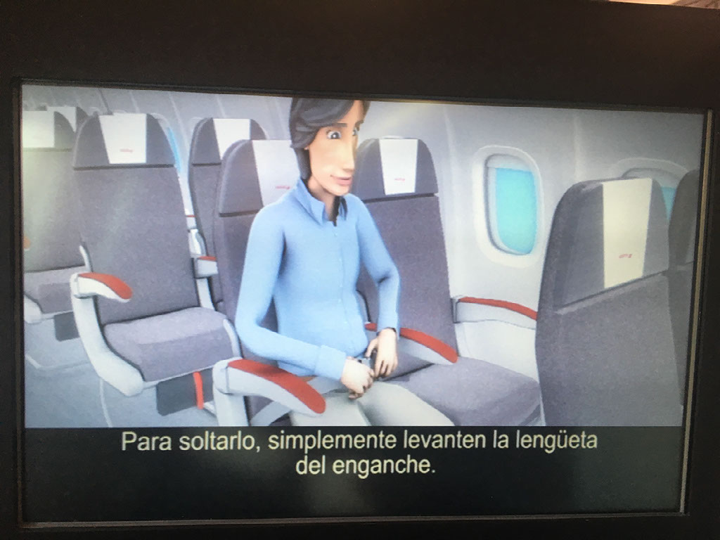 The animated guy on the safety video is permanently happy, and breaks into a huge smile when the oxygen masks come down. Really mate?