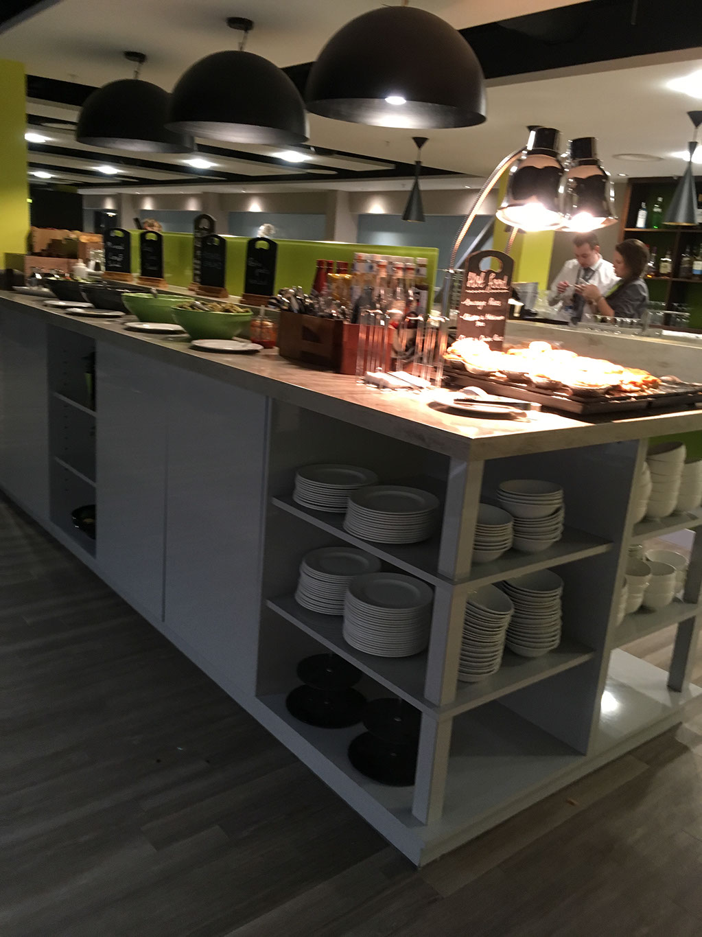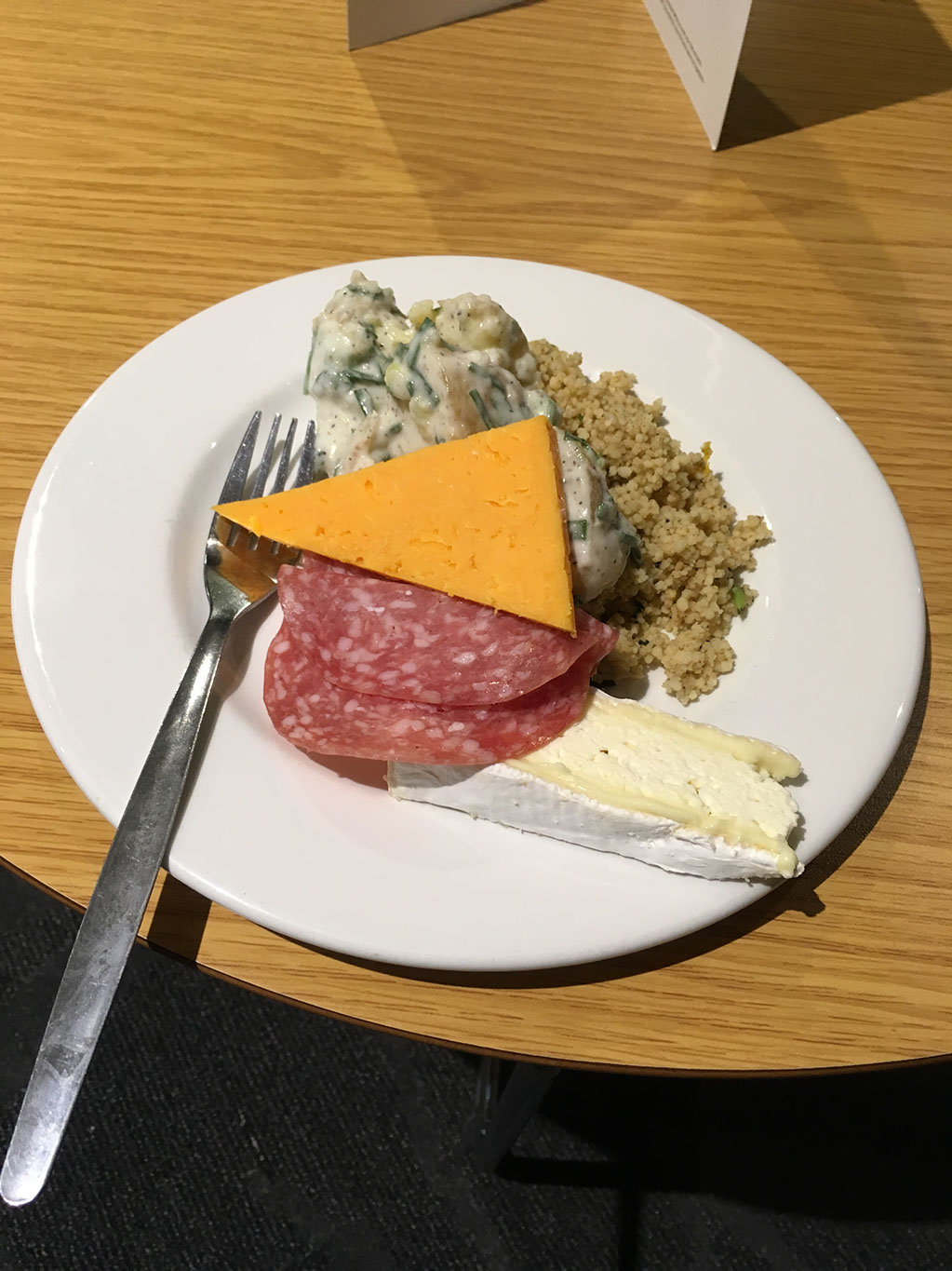 Most of the seating is reminiscent of a shopping centre food hall, which seems apt. There are hot pastry goods and HP sauce, but I opt for a plate of cous cous, potato salad, cheese, and cold meat. It is pretty ropey stuff, especially the cheese. There aren’t many people around, most notable are the women to our left who engage in a loud Skype video call to show a child off to another relative, and at one point summon the lass from the front desk to provide “how to take a screenshot on your phone” tech support.