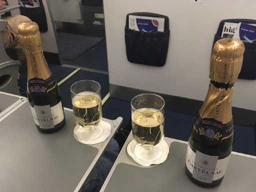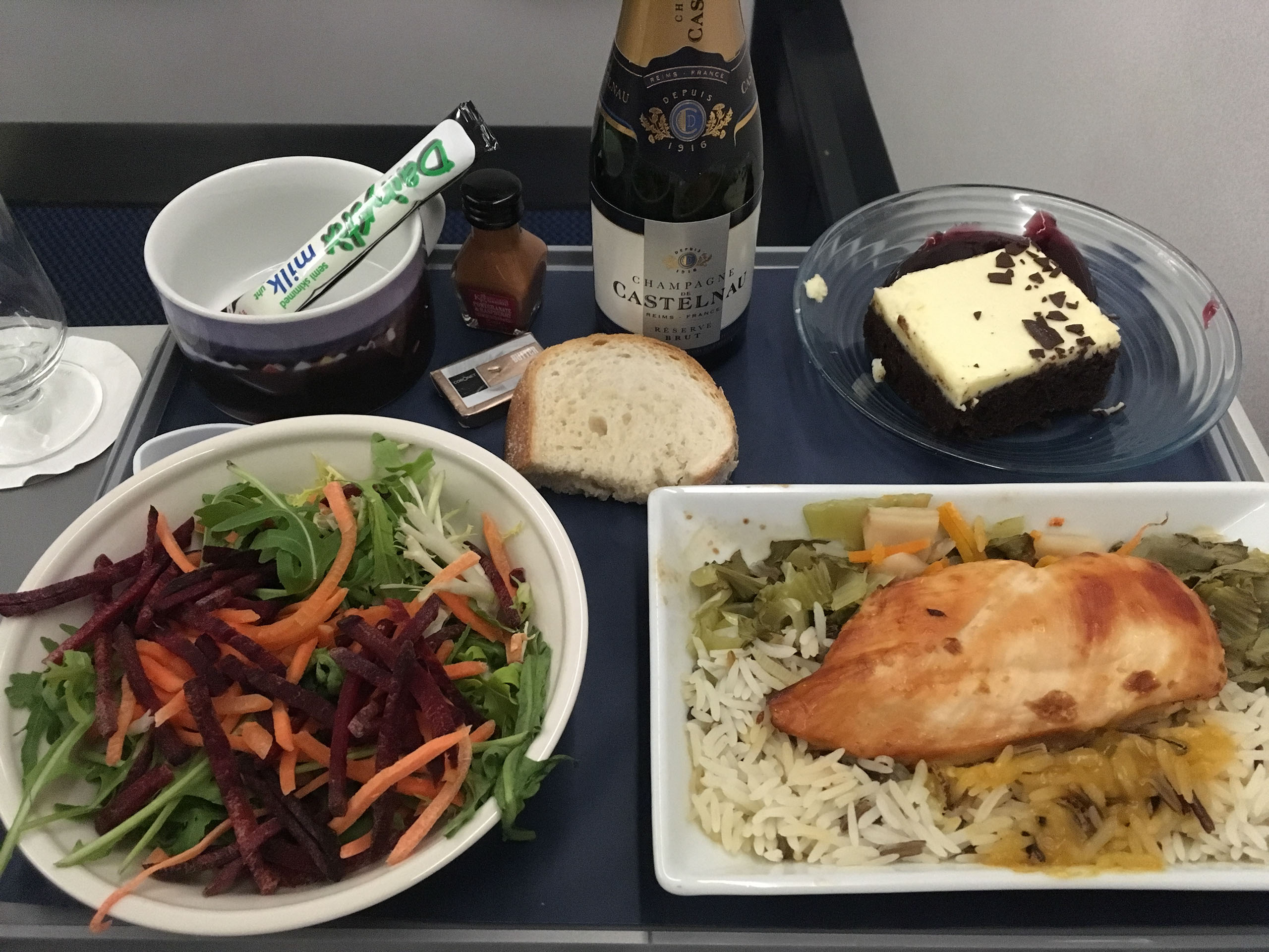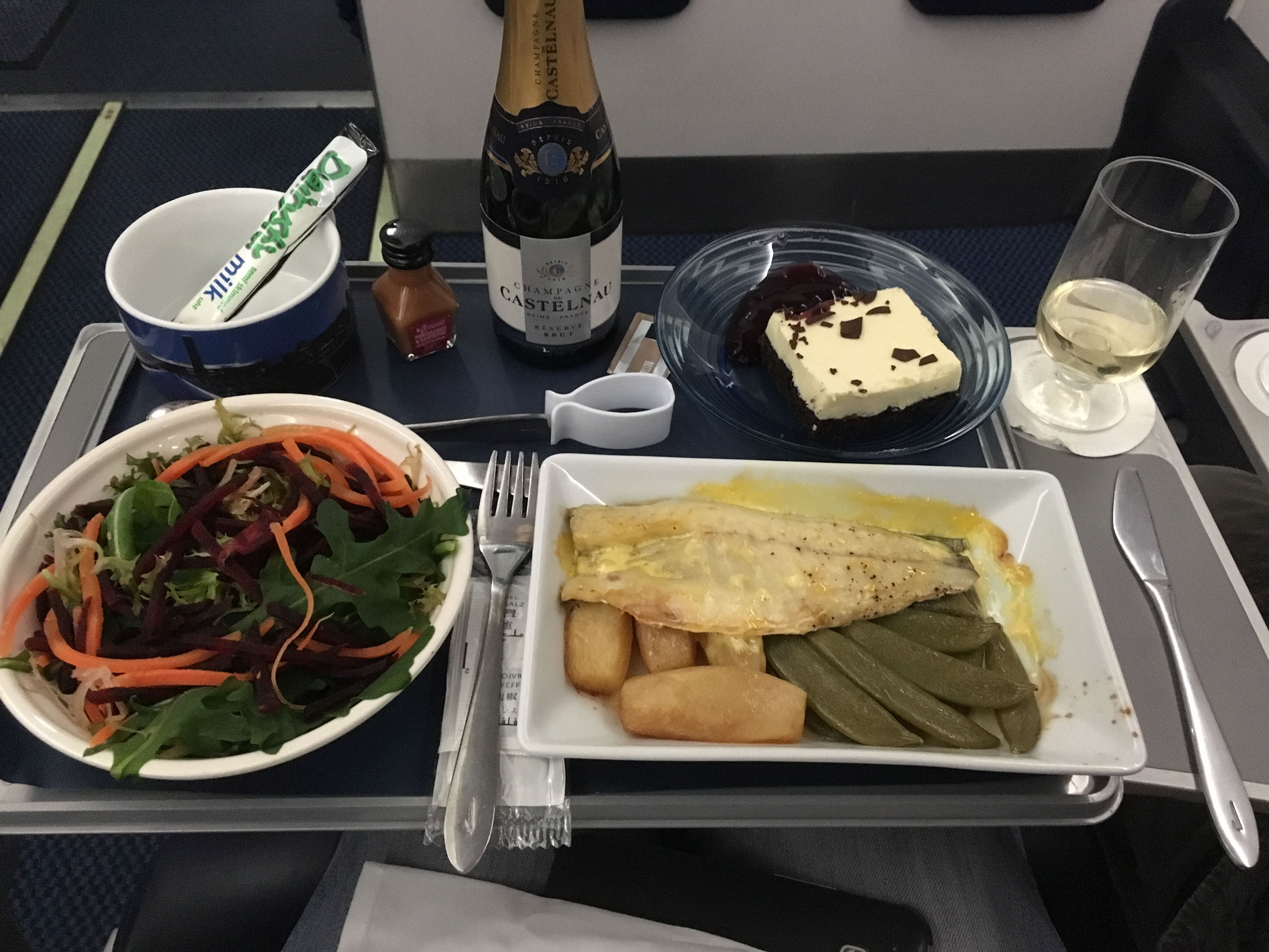 We opt for one of each dish so we can both try both, and would like to accompany it with more champagne please. In fact, as far as we can tell, everyone in business class is on the champagne except for the guy in row 1 necking Coca Cola.