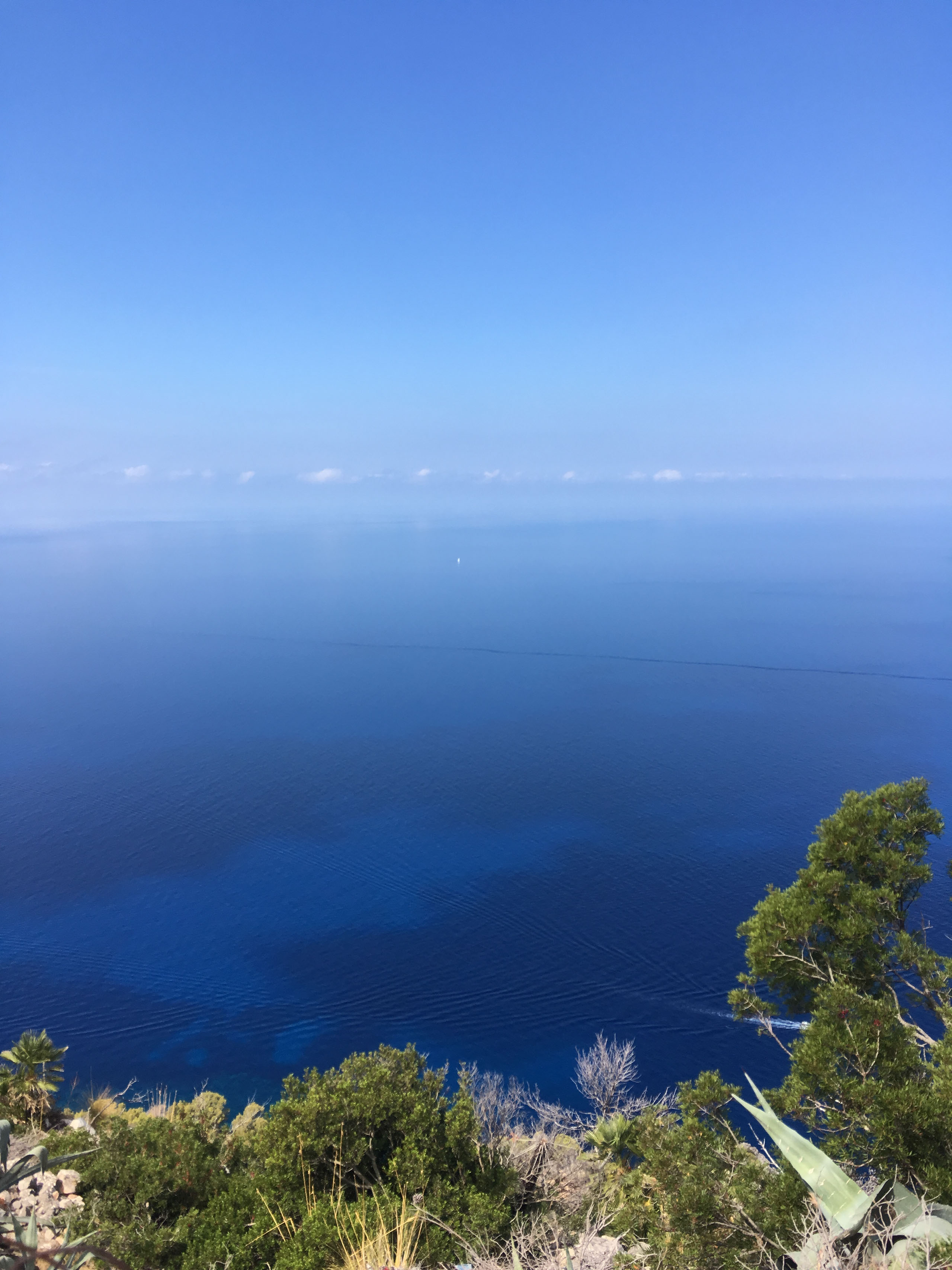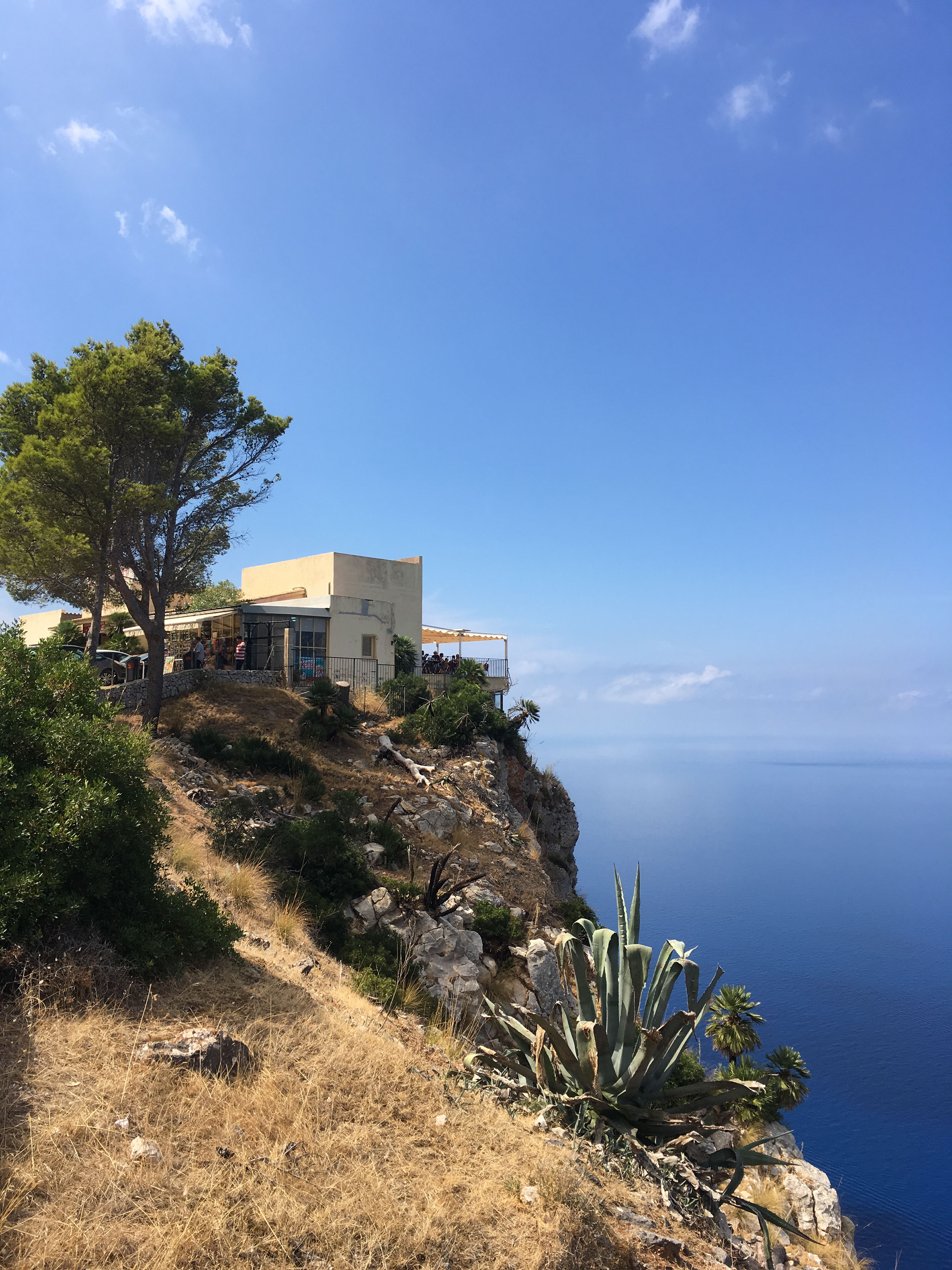 Once we stop climbing, we reach the pinnacle, because that’s how mountains work. Apparently the peak is right next to the coast, and there’s a place to stop and look at the bluest sea in the world. Also a large bar/restaurant with a terrace. I manage to take a couple of photos but my legs are also in disagreement with the height.