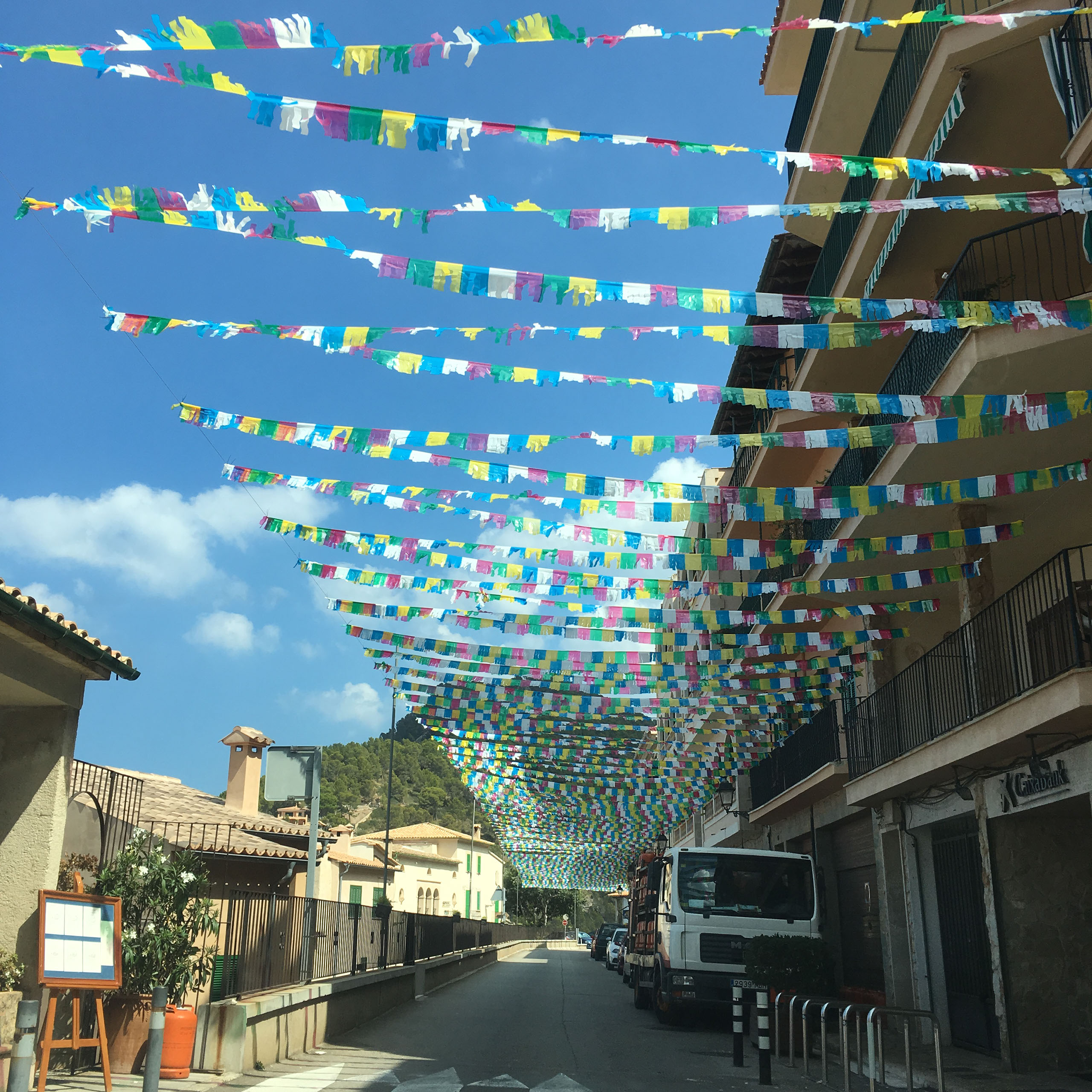 We work our way down into a town called Estrellencs, and our way back up afterwards, then our way down into Banyalbufar. As with several towns - including S’Arraco, where we’re staying - there either is or was recently a big fiesta, noticeable by all the street decorations.