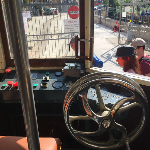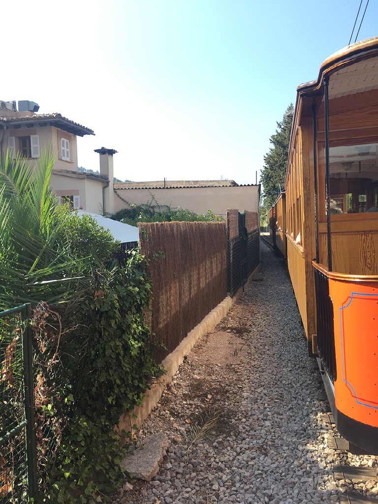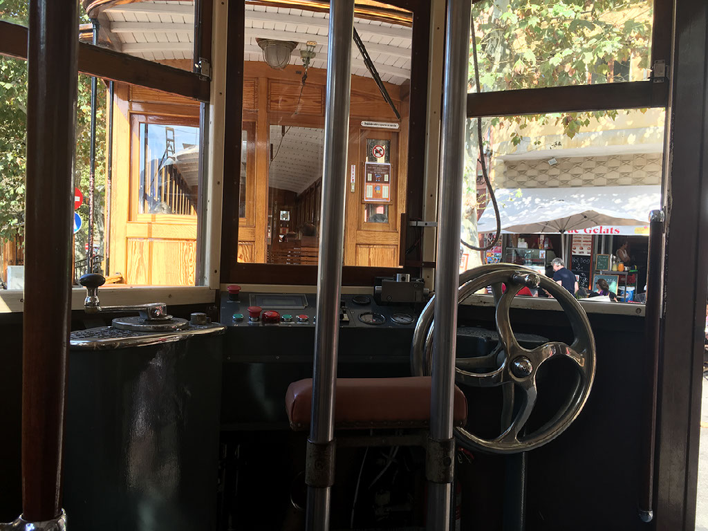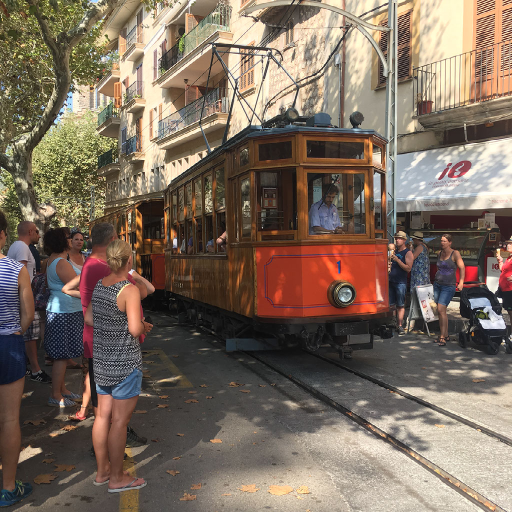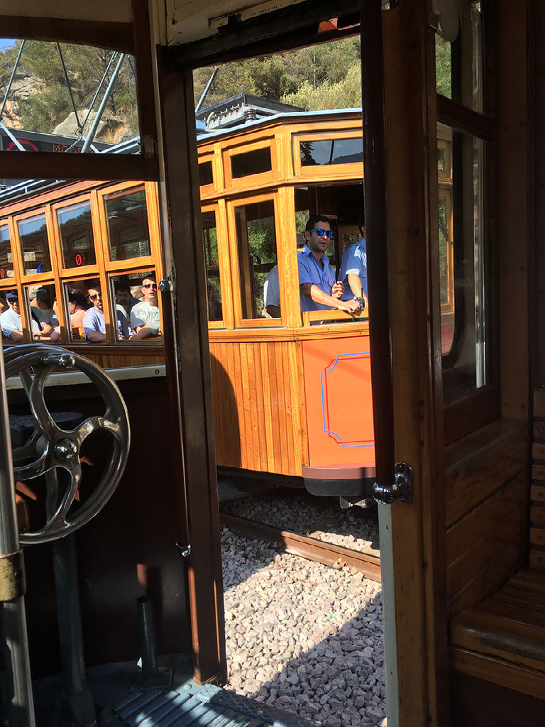 We go to buy tram tickets, and learn you buy on board. There’s one due in 10 minutes, and every half hour. We’re hungry so go to a tapas bar, who tell us the kitchen is closed. Whatever. We go back and wait for the tram instead, deciding to eat in Port de Soller at the other end.