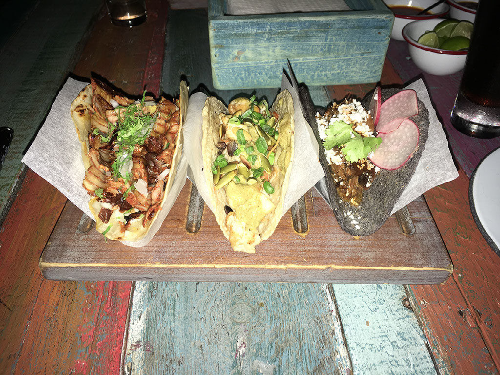 The schwarzbier was not as potent, nor nice. I mean it was OK, but basically a black lager. The food, however, was magnificent. 5 tacos between us - cheese, lamb, beef, pork, with numerous salsas and sauces and other accompaniments. You know how like what Wahaca serves, only way better and actually in Mexico.