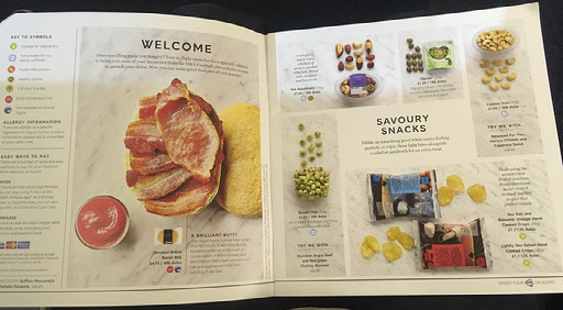 These are some pretty crufty old Club Europe seats, but comfortable enough. There’s a small monitor attached to the wall in front of us which I expect will show us a moving map throughout our journey, but it never comes on. In pocket in front of Helen’s seat there’s the new “buy on board” brochure, pimping BA’s innovative “pay for things we used to give you for free” catering strategy.