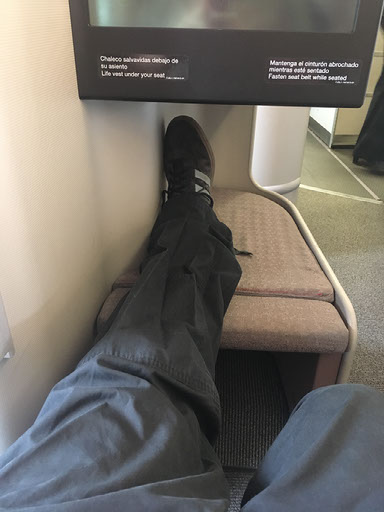 Helen has a great pastry, I have a bacon roll and an egg roll, and then at 0530 the place gets very busy very quickly, including a large influx of kids. Thankfully they are all gone again within 10 minutes because everyone’s off to Geneva. We, however, are off to Madrid, and as we approach gate B33 there’s a very large amount of people around. Thankfully priority boarding is working fine and we can scoot past them all. Onboard, we’re directed to turn left - sadly, not because this is a long haul plane, though it is a 767 (i.e. it has two aisles, 6/7 seats across). We’re in the front row on the left, which is obviously row 2.