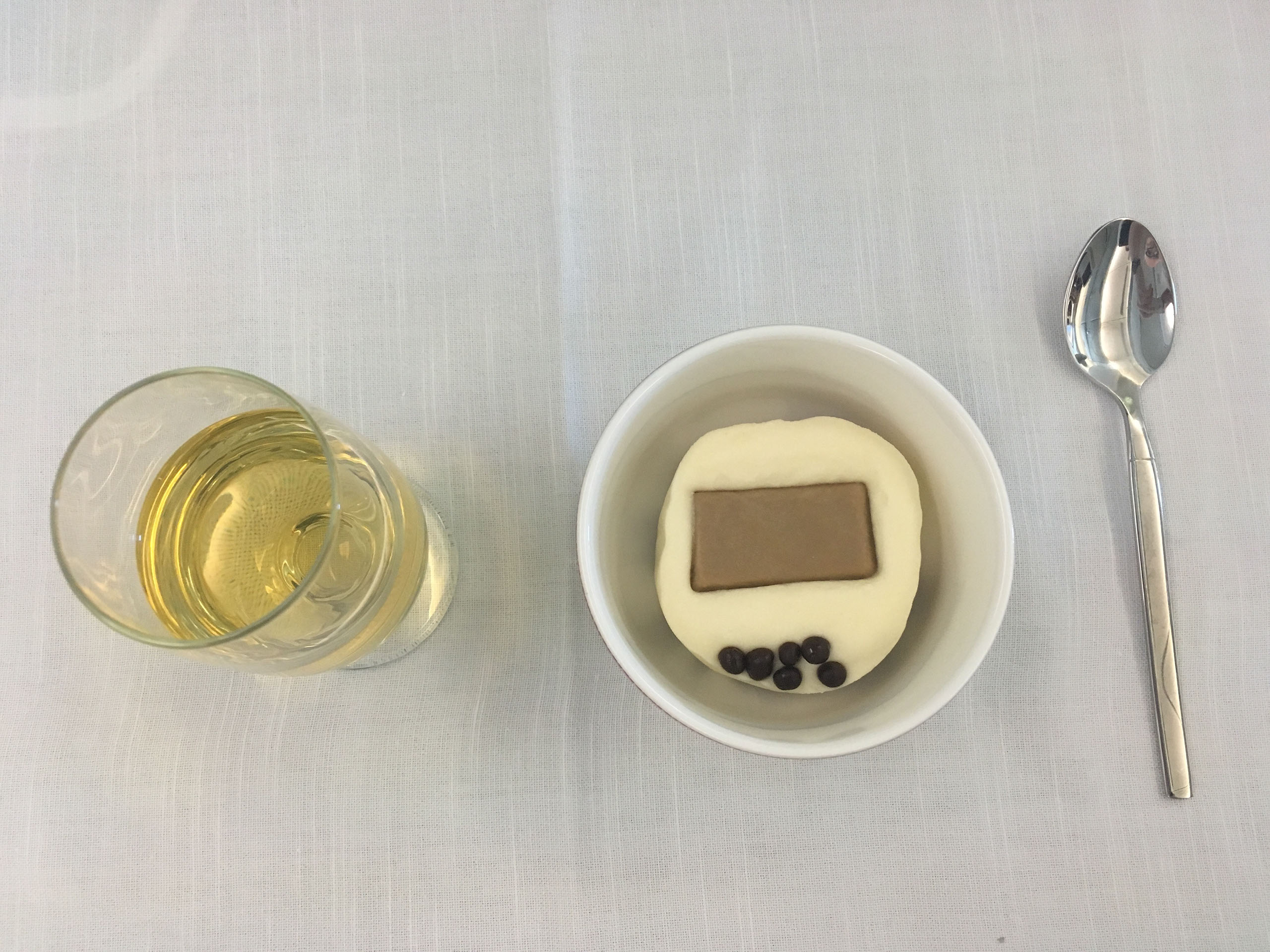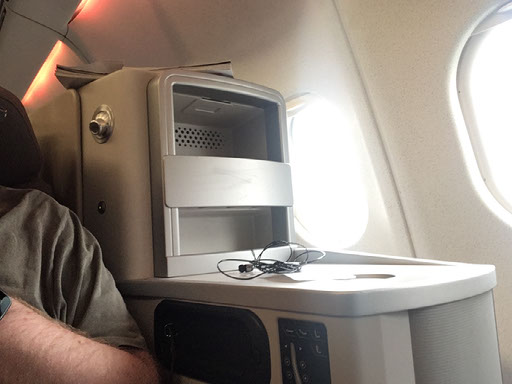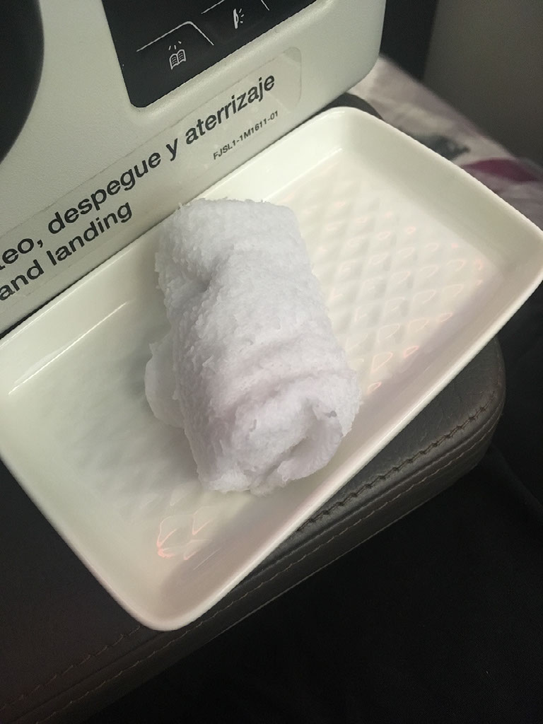 Leg room is obviously great, and I stretch out under the rebooting Linux splash screen. There’s ample time to play with the seat controls and fill up all the little storage spaces with stuff. A hot towel comes, which is pleasantly not scaldingly hot, and better yet is presented in its own little dish. I don’t know why I’m so tickled with this.