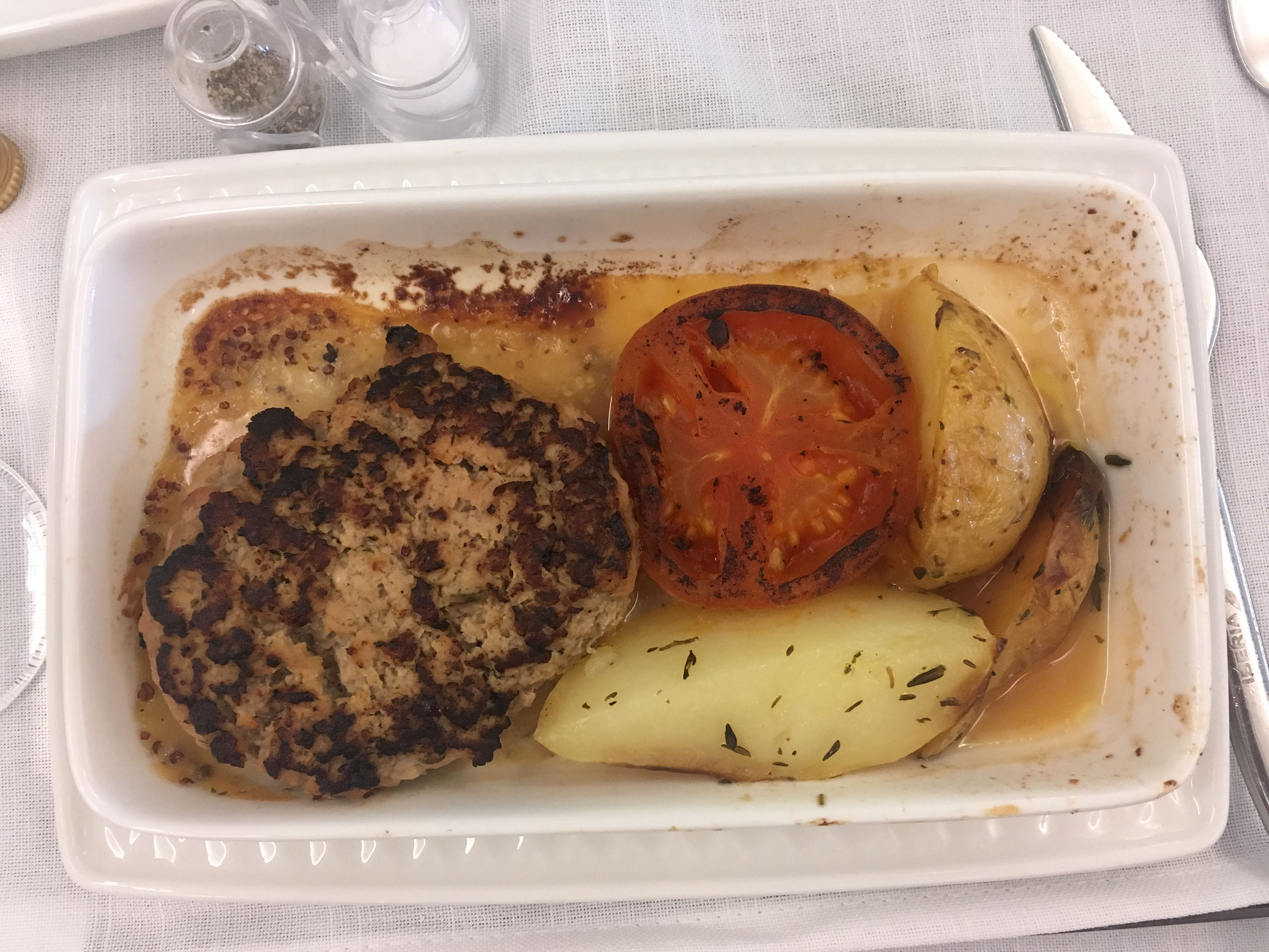 Cheese and quince; chicken consommé; salmon and cold mash; blue cheese and cranberry with leaves. This whole plate is one of the nicest starters I’ve ever had on a plane. The cheese in particular is fantastic.