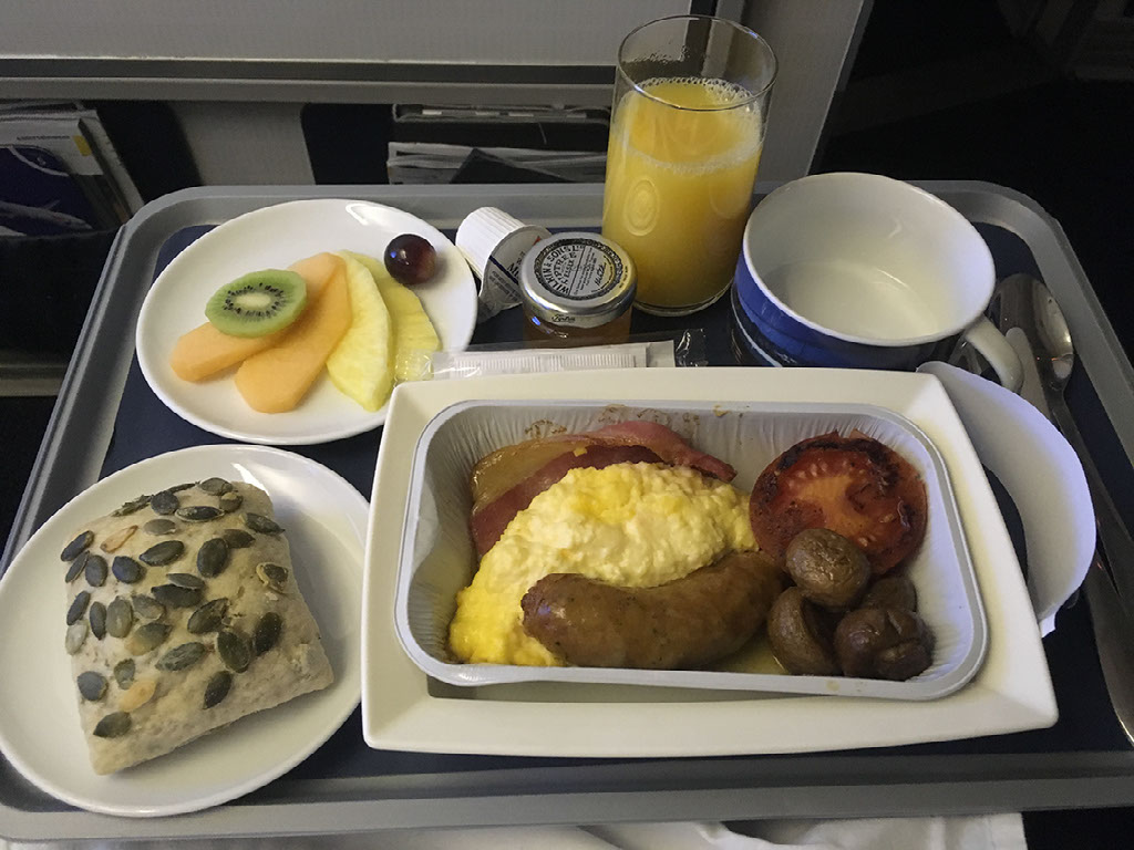Thankfully they don’t charge for stuff in business yet. In fact, after the hot towel service an extremely pleasant and friendly member of cabin crew comes to offer us our choice from 3 different breakfast options - though there’s only 1 of the veggie plates. I go for the hot brekafast, Helen opts for the cold cuts.