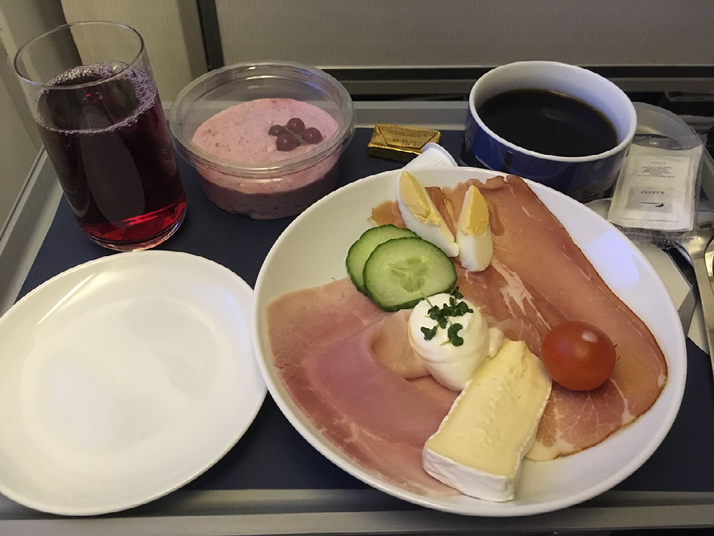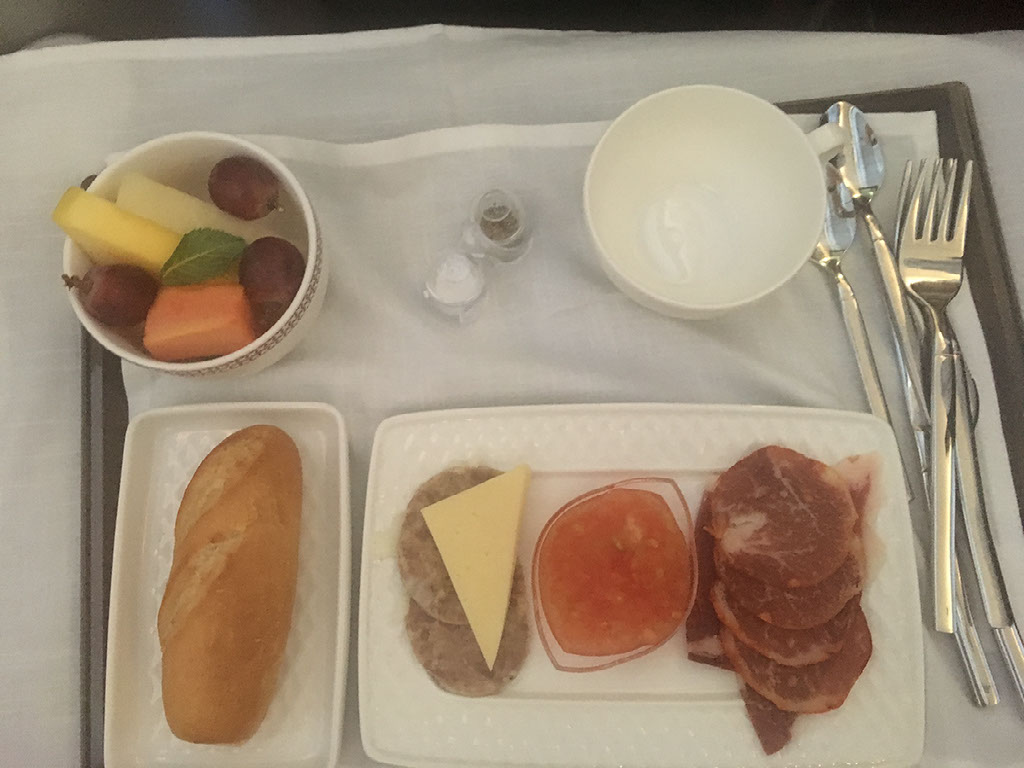 Within half an hour most of the cabin start to wake up, a few windows are opened, and the “Good afternoon!” meal service starts. A bowl of fruit, some bread, some cheese and meats. The meat is great.