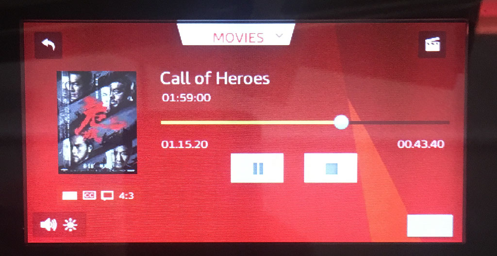 The menu looks nice, and they are very proud of their wine selection which unfortunately means bugger all to me. I plug some headphones in and start watching a Hong Kong movie called Call Of Heroes. It is utterly fantastic and I already want to watch it again.