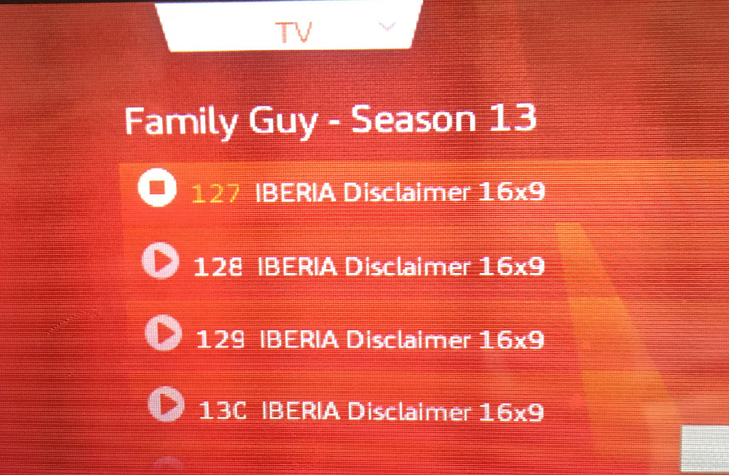I decide to watch some Family Guy. Sadly they only have Season 13, the widely panned experimental season comprising over 130 “episodes” of a widescreen disclaimer from Iberia.