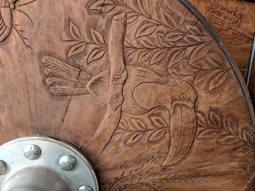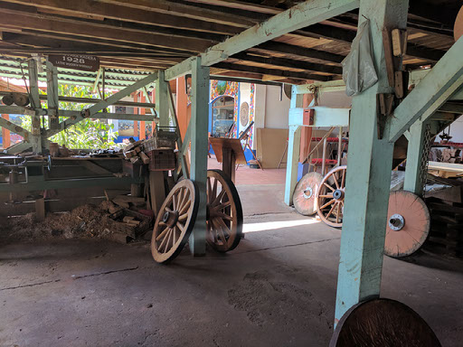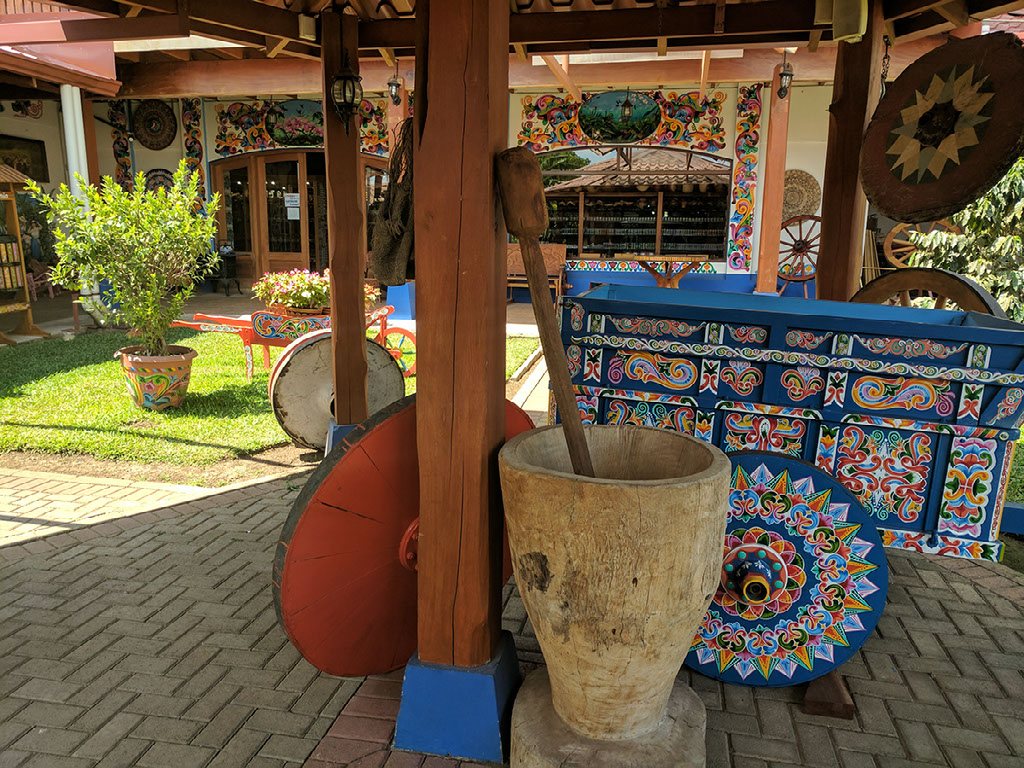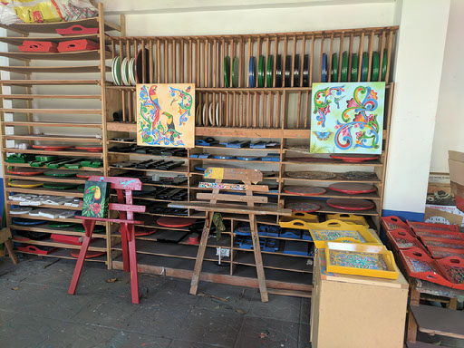 There’s wooden animals and wooden bowls and wooden kitchen stuff. There’s glassware and tacky souvenirs and various sizes of ox cart. There’s a whole huge room of t-shirts and ponchos and other clothing. There’s masks and chests and bangles and jewellery and fridge magnets and bottle openers and trays. And, out back, there’s people painting and decorating wood recently worked in the workshop, and you can go wander around freely so we do.