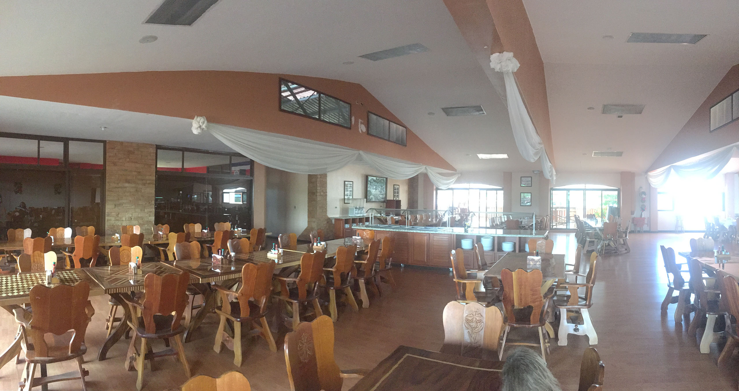 Up there, we are obviously the first people to enter all day. They take the tops off the food at the counter and we point at things which get put on our plates, put the plates on trays, ask for a couple of beers, and go to the till where the guy is surprised we want to pay in the country’s own currency. Then we turn and face the huge giant room with tables for 20 or so, several marked reserved.