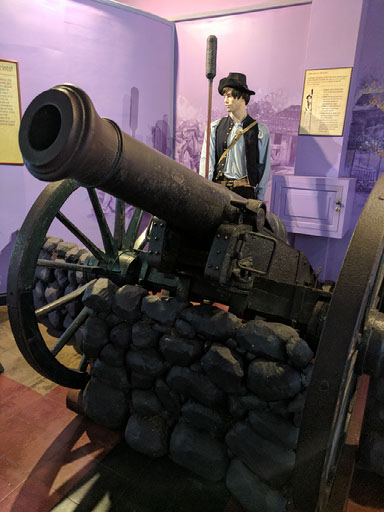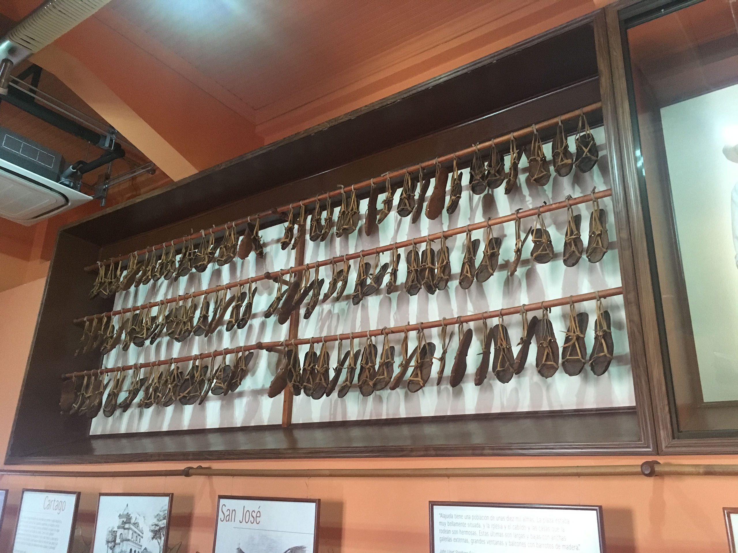Now, to the museum. There’s a big museum by the main town square. It used to be a jail, and tells the story of Costa Rica’s continued independence by having an army back in the day and shooing off invaders from all sides. Half the displays have English translations but plenty do not. One of the first things is a big display of shoes, of course.