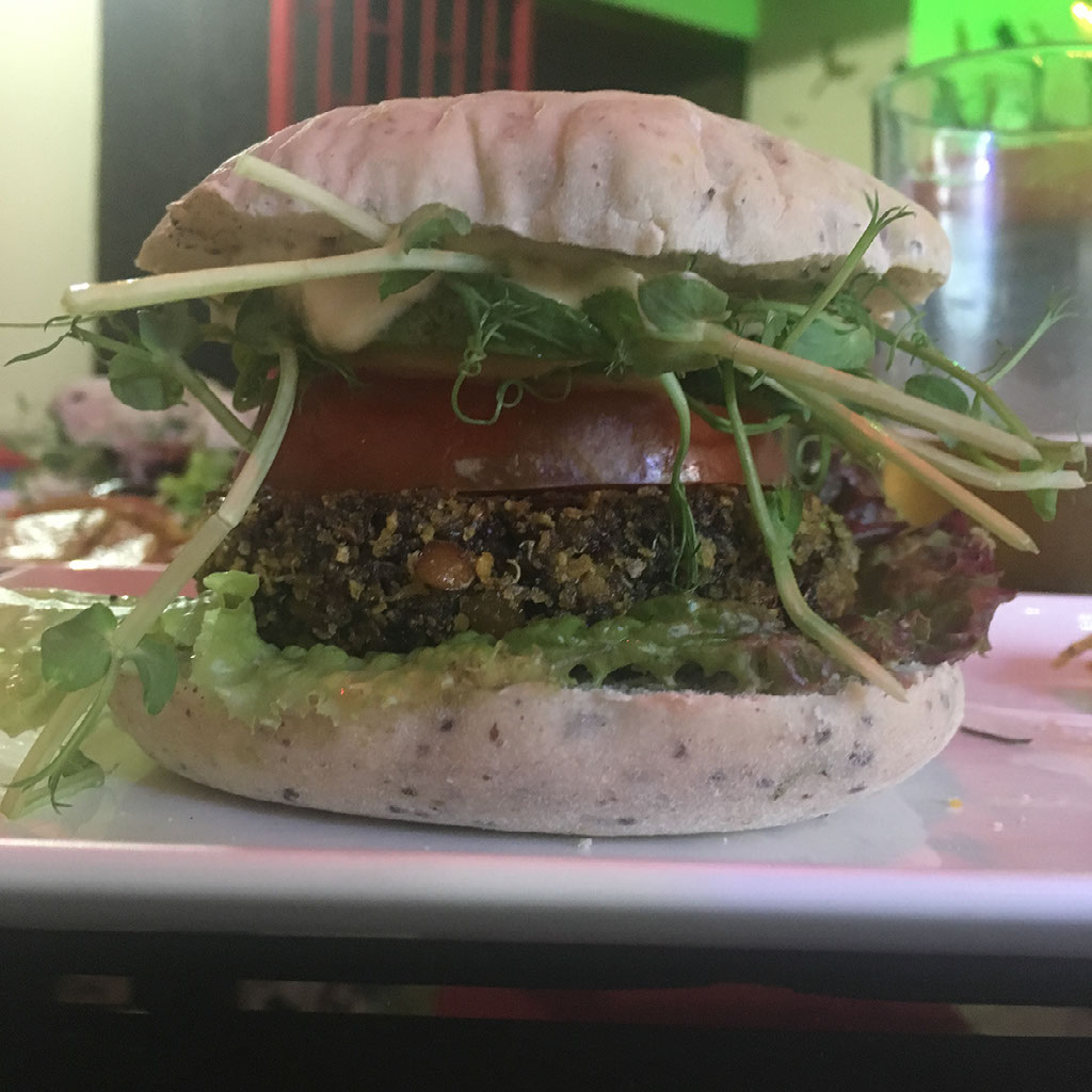 The food arrives - we both ordered burgers. Helen has hamburguesa hongo portobello, which is to say “giant mushroom in a bun” and mine is the aforementioned quinoa. It’s actually bloody lovely, as are the super thin potatoes.