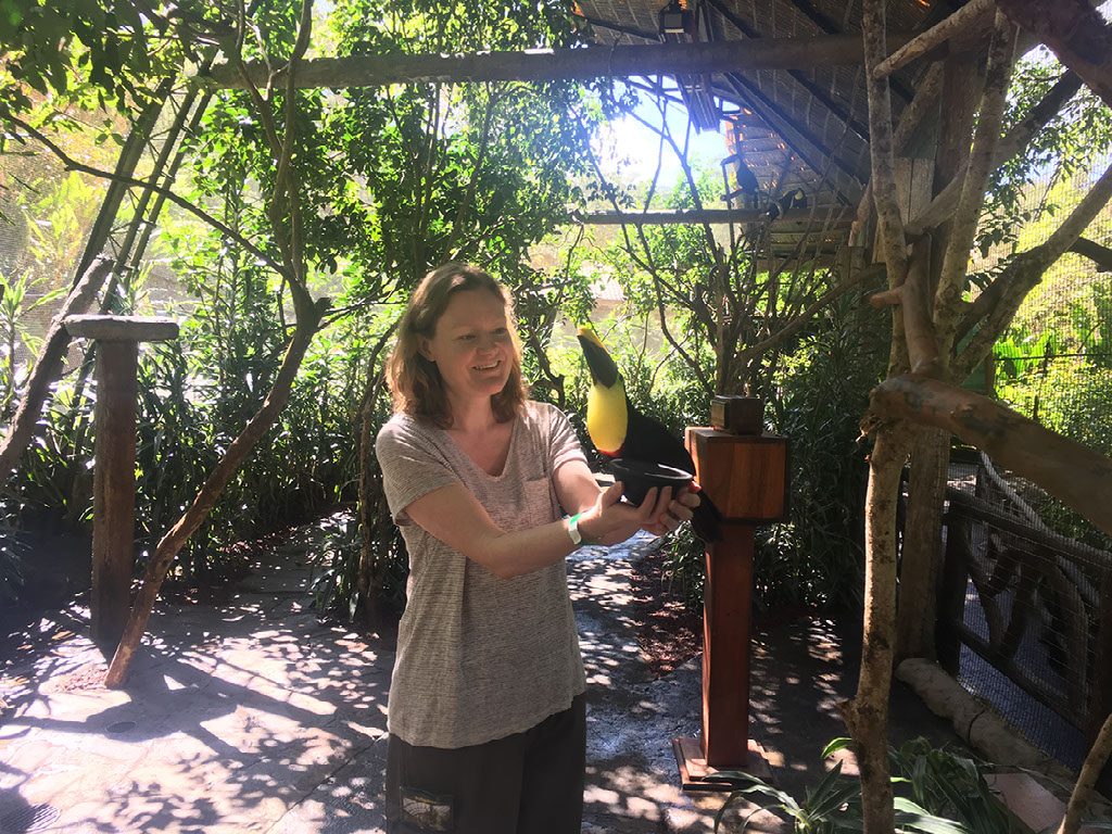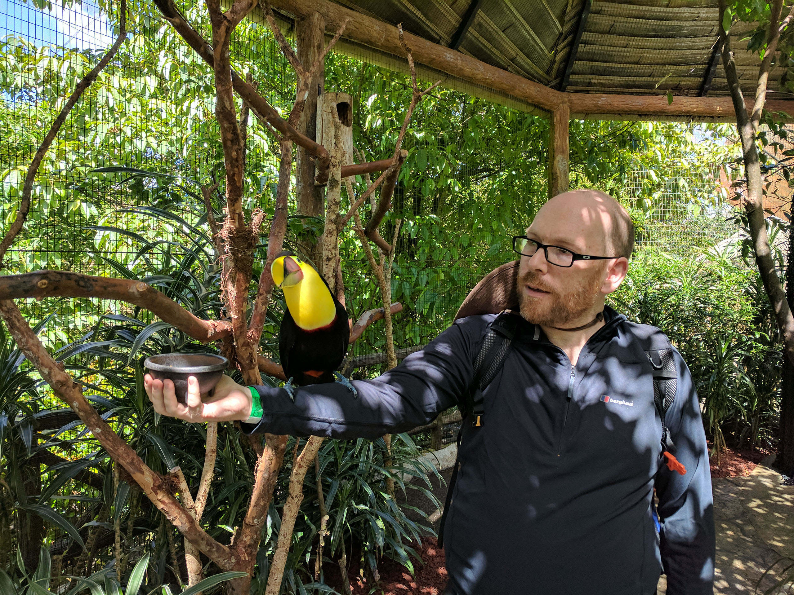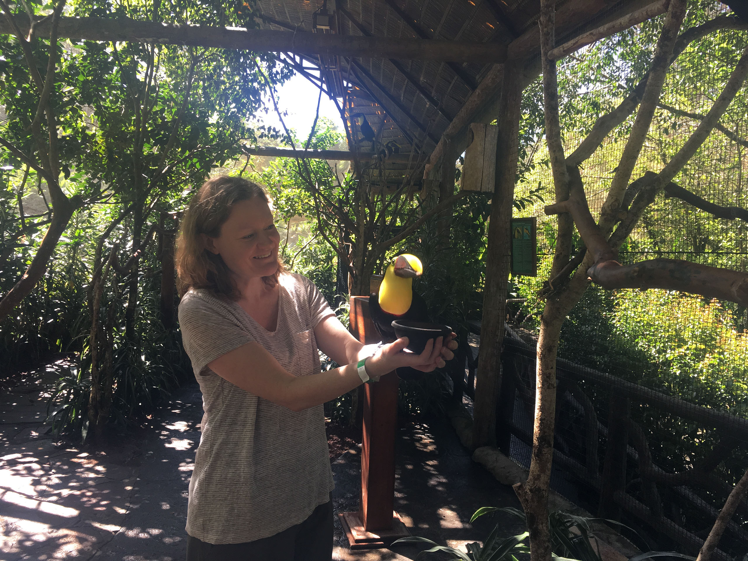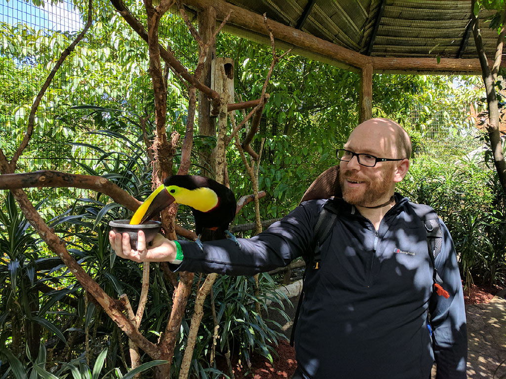 There are about 8 toucans in there. All of them are rescue animals, mostly taken off people who had them as pets. It’s been illegal for some years now to have many of these wild animals as pets, and throughout the park we won’t see any animal that has been taken from its natural habitat; indeed, we’re told because of their previous life not many of them would survive if they were placed back out there. So it’s a mixture of sadness but privilege. Seriously, having a toucan hop onto your arm because you’re holding a little plate with nuts in is amazing.